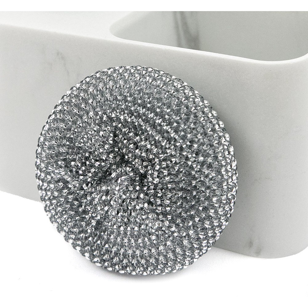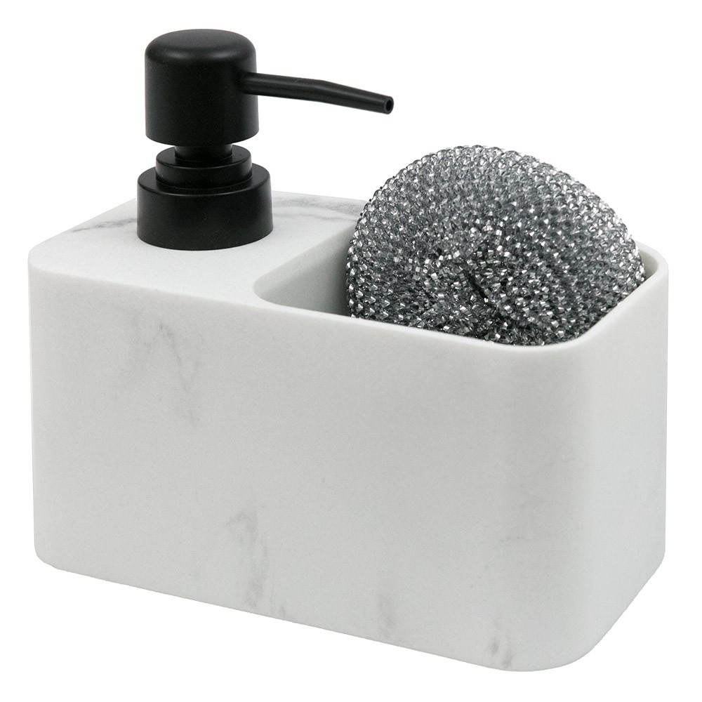 Nowoczesny pojemnik do płynu do naczyń z dozownikiem wraz z gąbką do mycia w kolorze szarym. Wykonany jest z wysokiej jakości polyresinu. Jego największą zaletą jest to, że do złudzenia przypomina marmur.