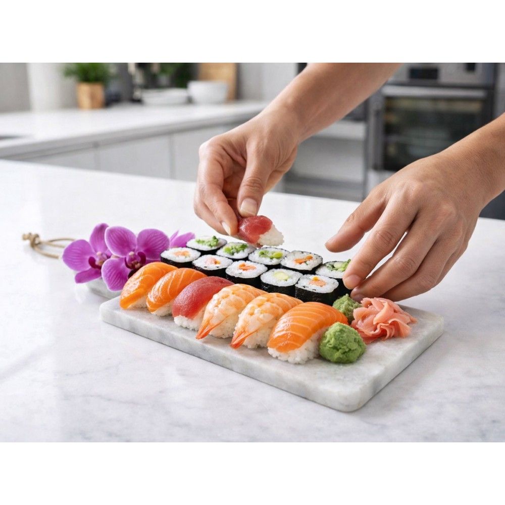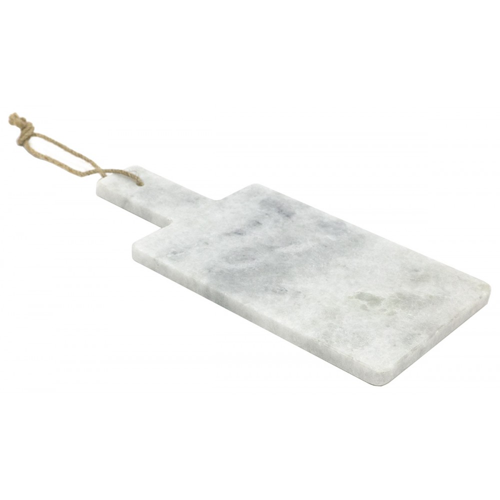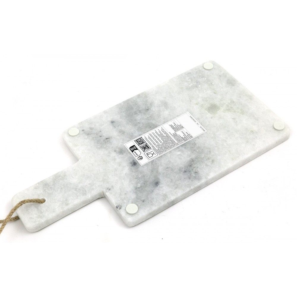 Marmurowa, prostokątna deska do krojenia / serwowania w kolorze jasnym szarym. Niezbędna pomoc kuchenna, która może być zarówno wyjątkową dekoracją. Największą zaleta jest łatwe czyszczenie i brak jakichkolwiek drobinek w potrawach jak to zwykle bywa w klasycznych drewnianych deskach. Dodatkowo deskę można schłodzić, dzięki czemu podawane na niej posiłki utrzymają odpowiednią temperaturę, co jest niezwykle przydatne w przypadku wędlin, owoców morza czy sushi.