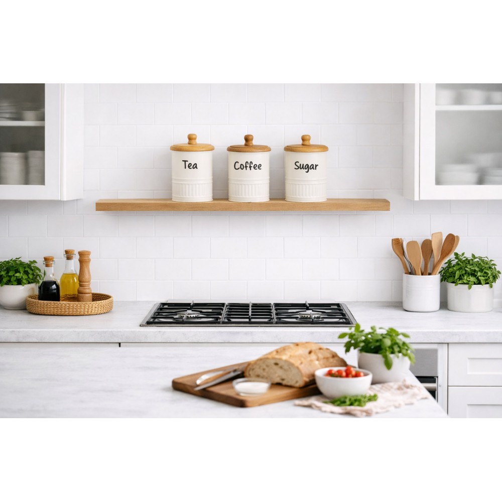 Pojemniki idealnie nadają się do przechowywania herbaty, kawy, cukru, a czytelne oznaczenia ułatwiają organizację przestrzeni kuchennej.