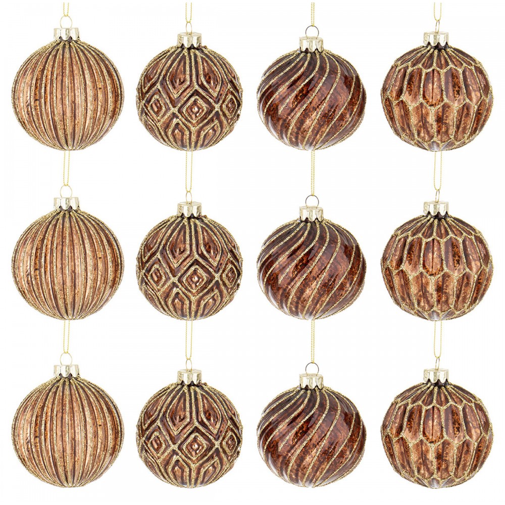 Elegancki komplet 12 brązowych bombek choinkowych to idealny wybór dla osób ceniących klasyczny, ciepły i naturalny klimat świąt. Bombki o średnicy 8 cm zostały ozdobione efektownymi wzorami w odcieniach złota, które nadają im wyjątkowego charakteru i głębi.