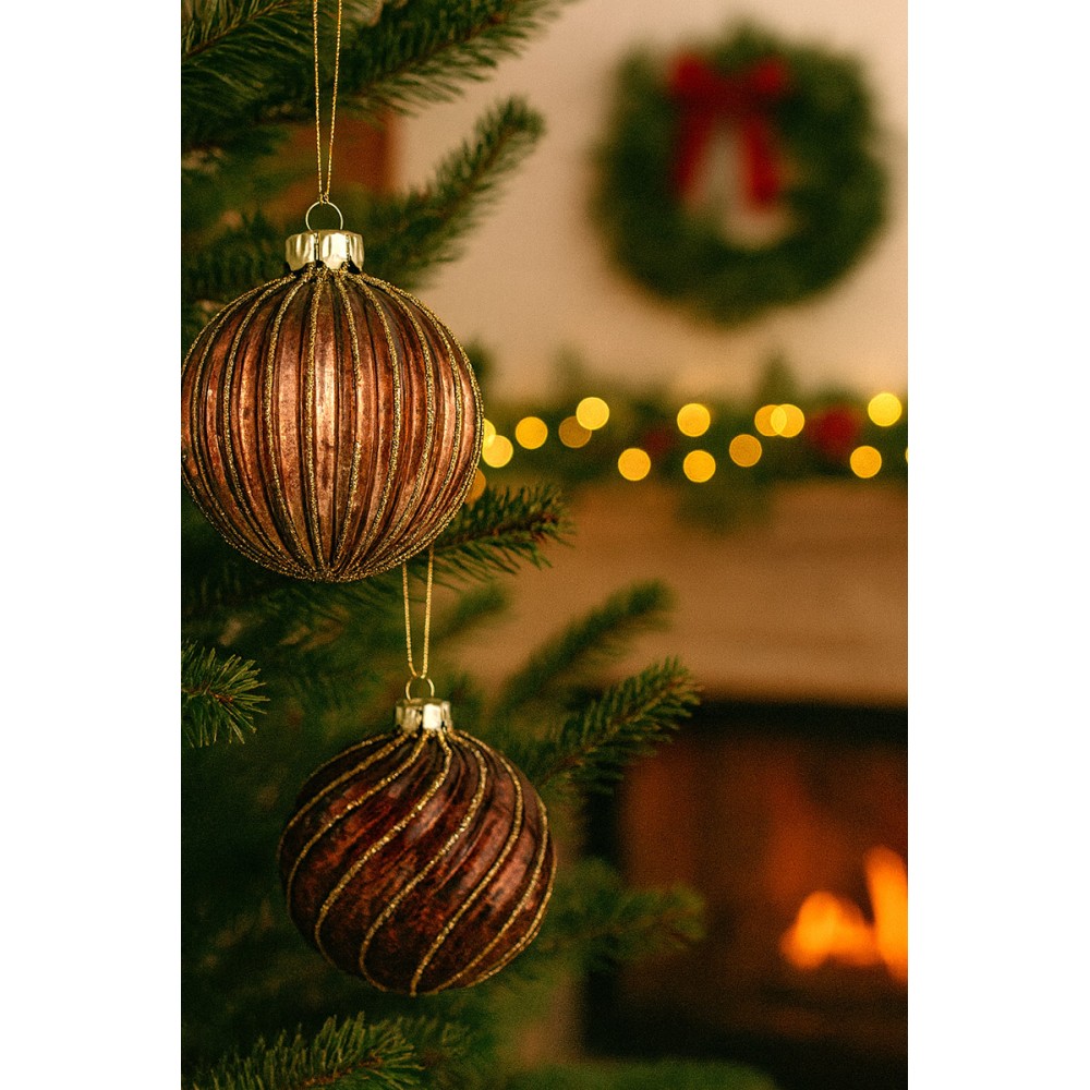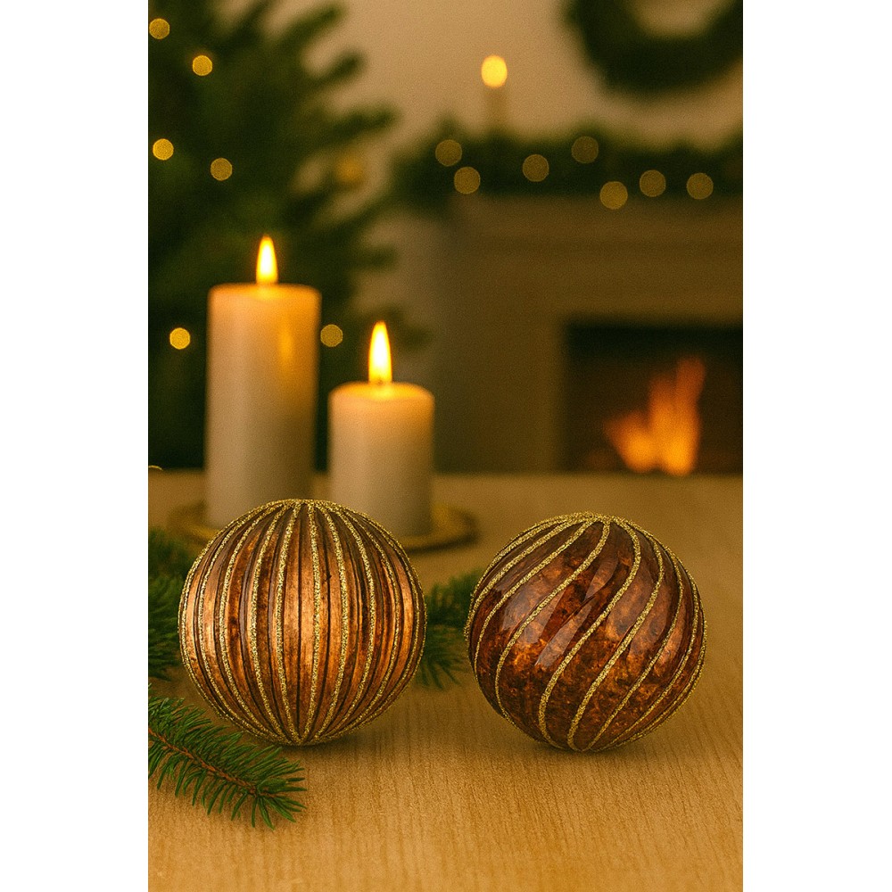 Każda bombka posiada inny, oryginalny reliefowy motyw — prążkowany, spiralny, geometryczny lub strukturalny — podkreślony delikatnym złotym brokatem. Połączenie brązu i złota tworzy elegancki, a zarazem przytulny efekt, który doskonale komponuje się z zielenią choinki.