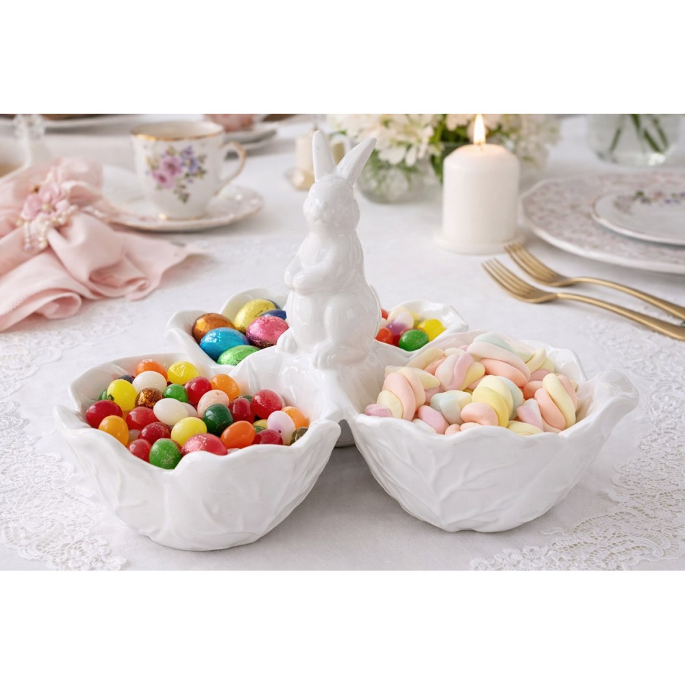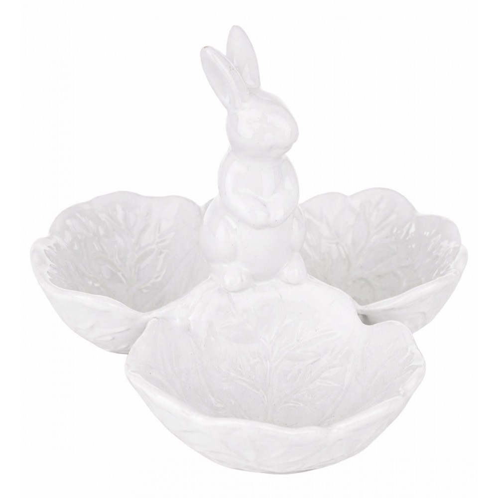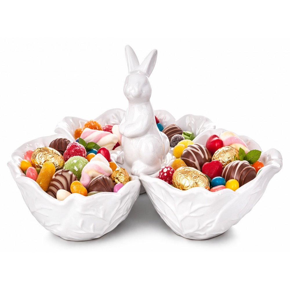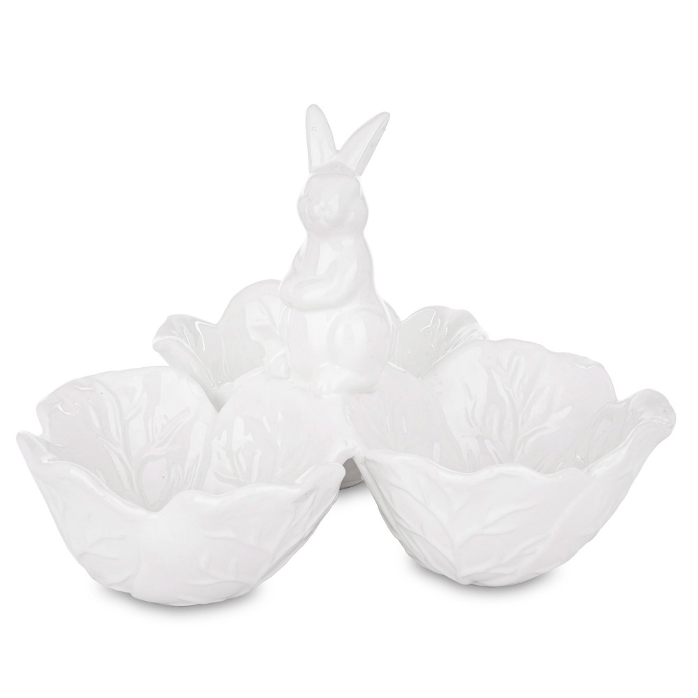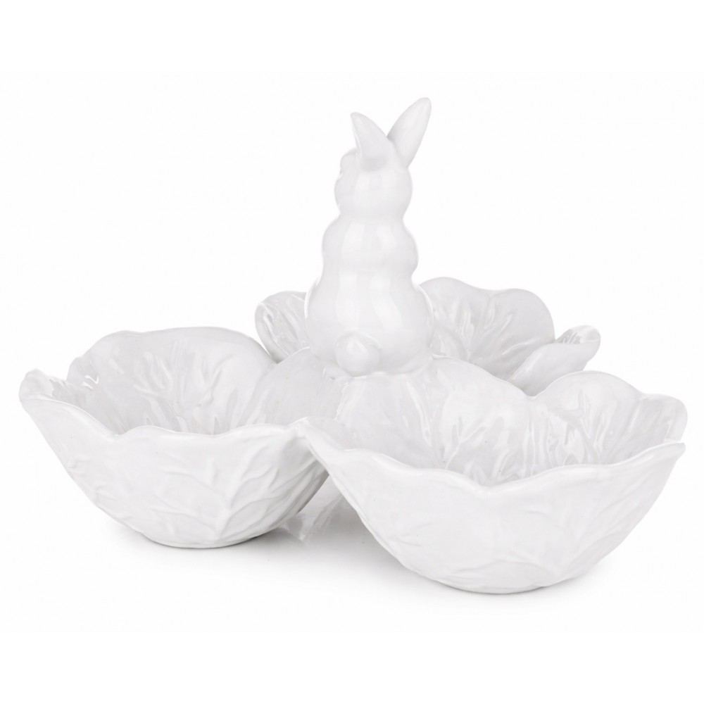 Przepiękne i subtelne miseczki dekoracyjne wykonane w klasycznym białym kolorze, ozdobione uroczym motywem zajączka. Delikatne tłoczenia inspirowane naturalnymi kształtami nadają elegancki i ponadczasowy charakter, dzięki czemu doskonale wpisują się zarówno w nowoczesne, jak i klasyczne aranżacje wnętrz.