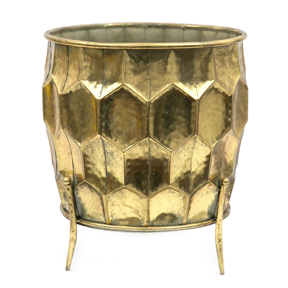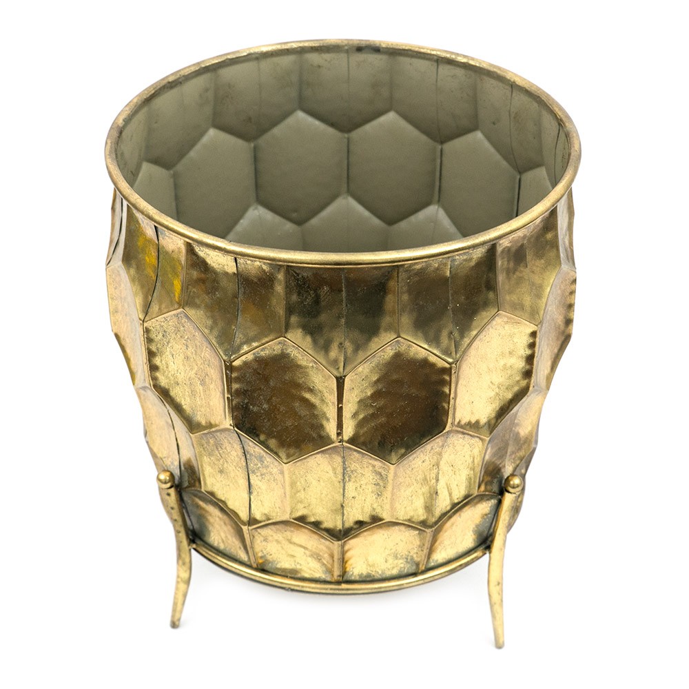 Efektowna osłonka dekoracyjna na trzech smukłych nóżkach to wyjątkowy element wystroju, który łączy elegancję z nowoczesnym designem. Złote wykończenie z delikatnym, postarzonym efektem oraz geometryczny, tłoczony wzór przyciągają wzrok i pięknie odbijają światło.