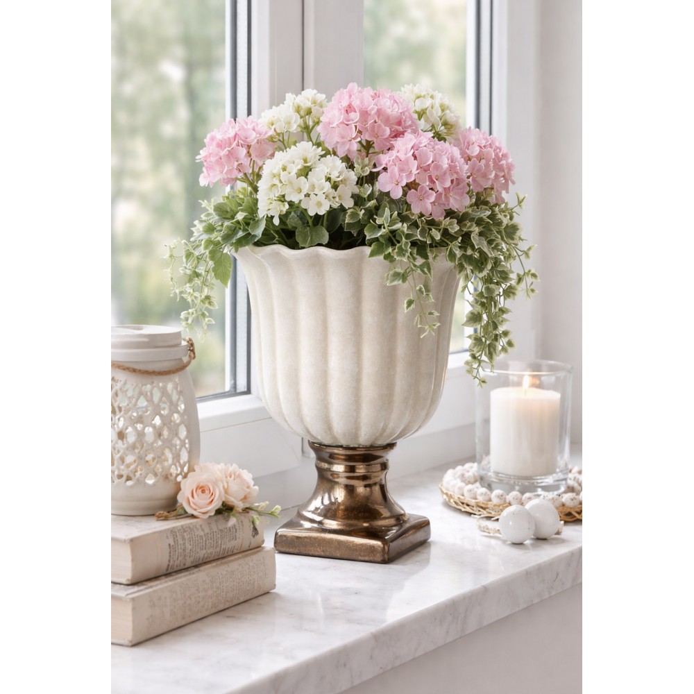 Niespotykana doniczka ceramiczna na nóżce w kolorze beżowym i brązowym. Szczególnie pięknie komponuje się z wiosennymi, zielonymi roślinami. Ta niezwykle oryginalna i elegancka donica wprowadzi wiele uroku do każdego wnętrza. Nie posiada otworu do odpływu wody. Idealna dla miłośników niespotykanych dekoracji.