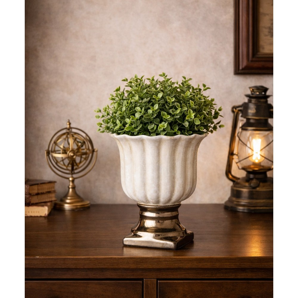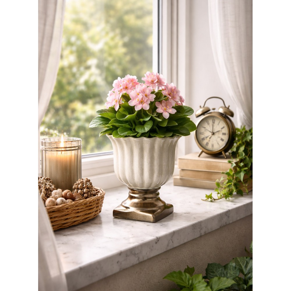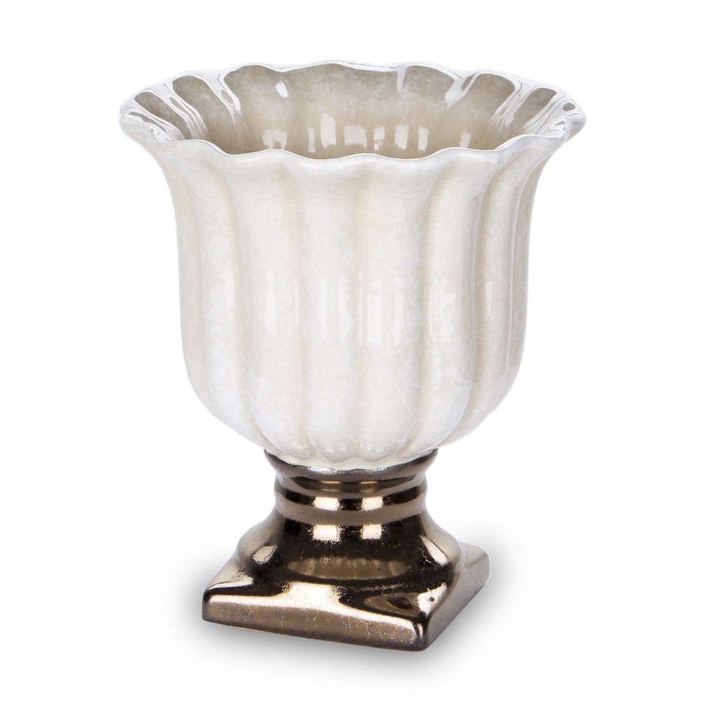 Niespotykana doniczka ceramiczna na nóżce w kolorze beżowym i brązowym. Szczególnie pięknie komponuje się z wiosennymi, zielonymi roślinami. Ta niezwykle oryginalna i elegancka donica wprowadzi wiele uroku do każdego wnętrza. Nie posiada otworu do odpływu wody. Idealna dla miłośników niespotykanych dekoracji.