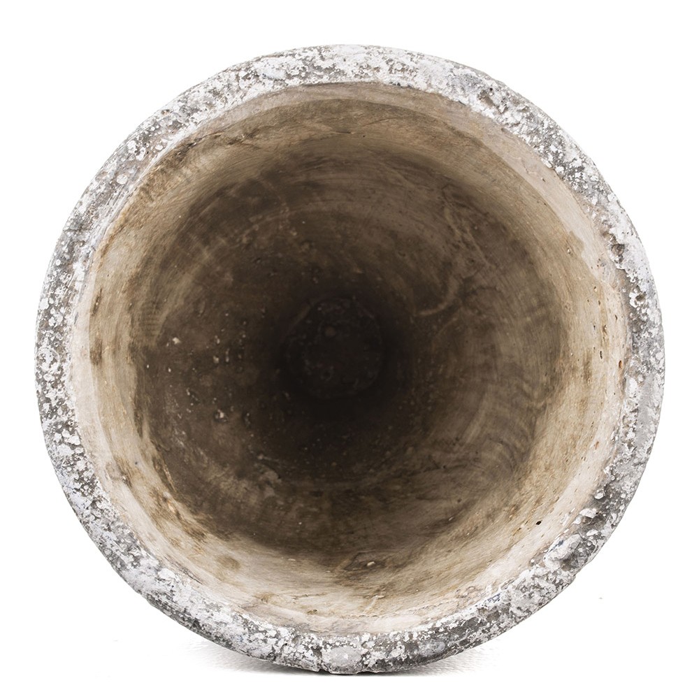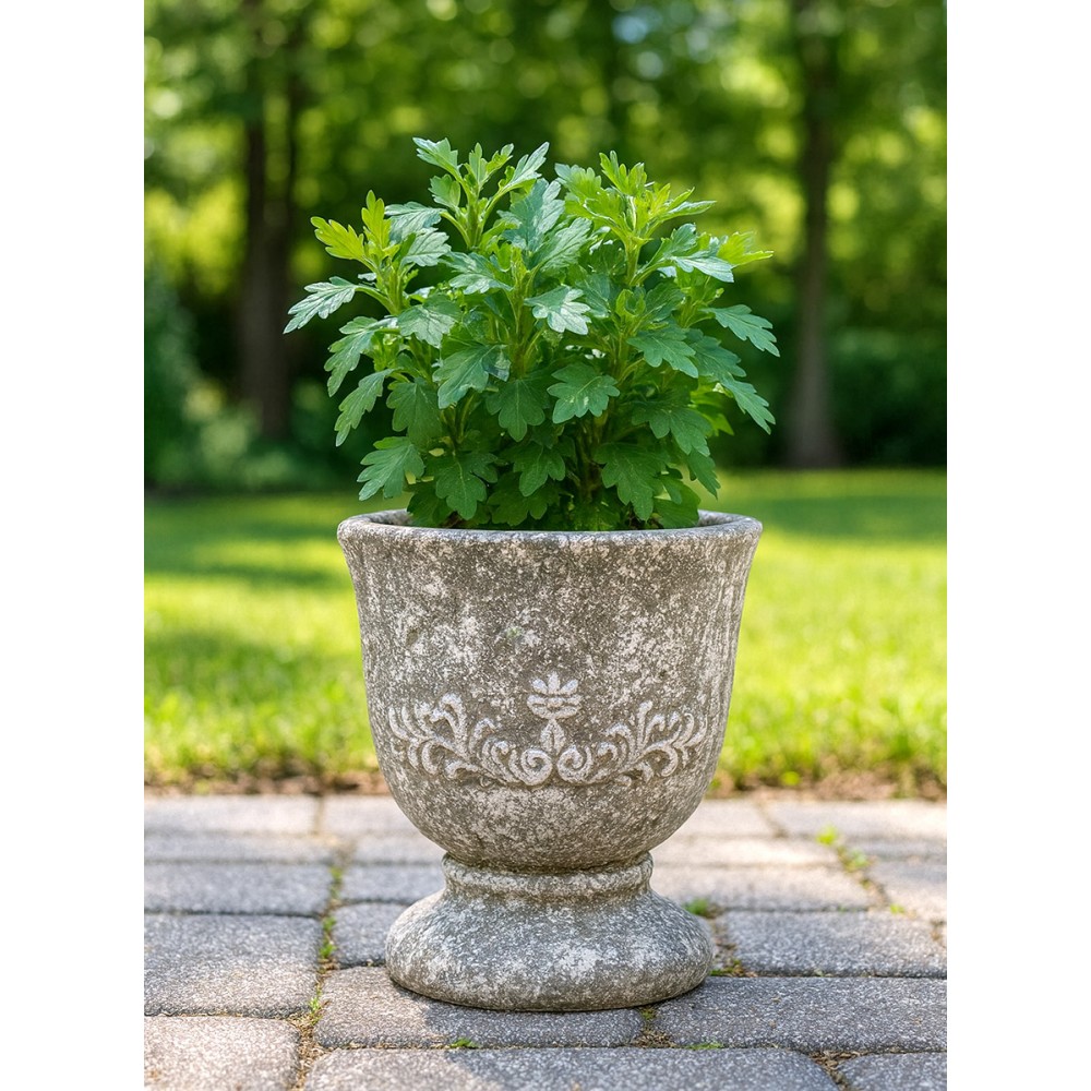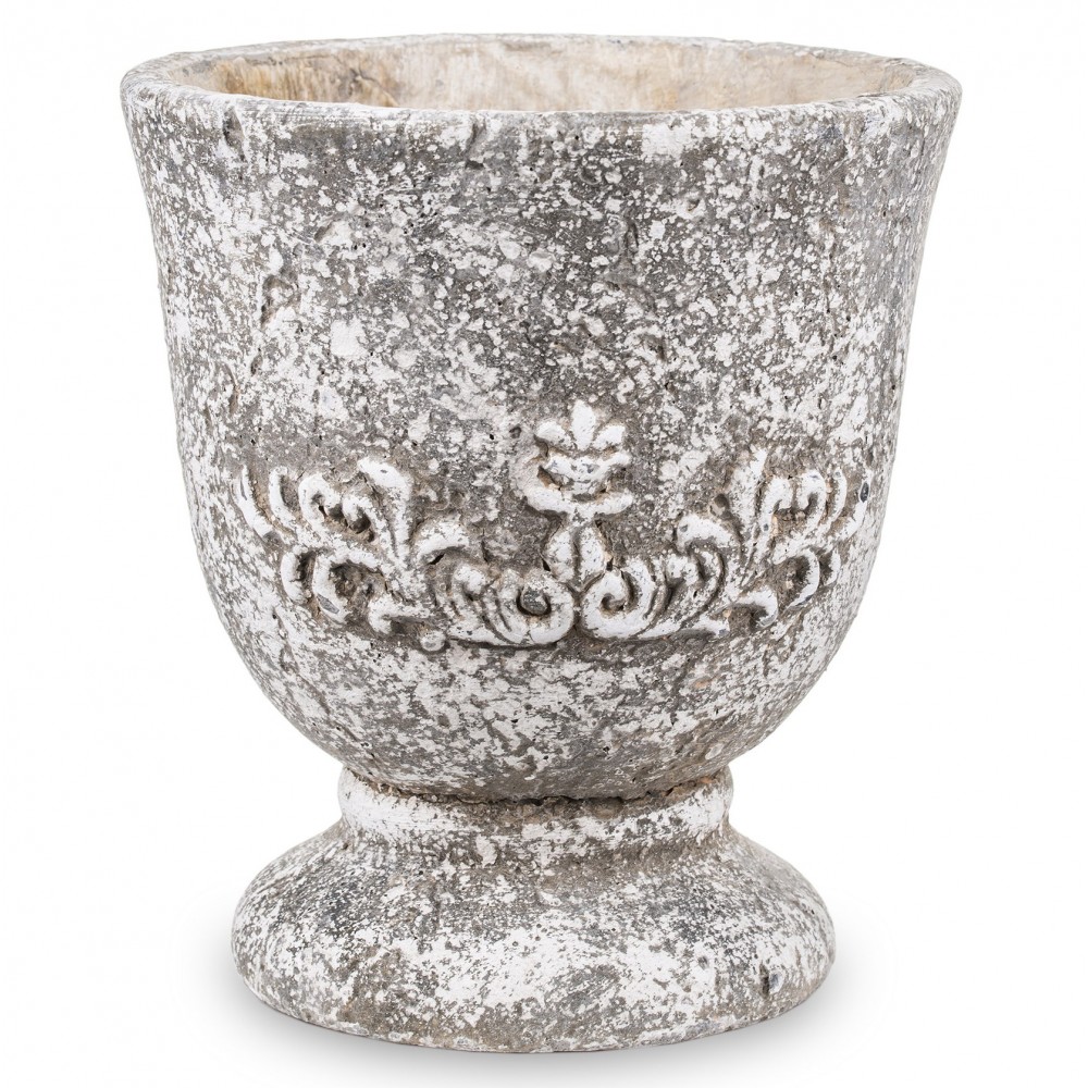 Stylowa osłonka wykonana z trwałego cementu, utrzymana w rustykalnym stylu z efektem postarzenia. Delikatne, kwiatowe zdobienia nadają jej elegancki charakter i sprawiają, że doskonale prezentuje się zarówno w domu, jak i na tarasie czy w ogrodzie.