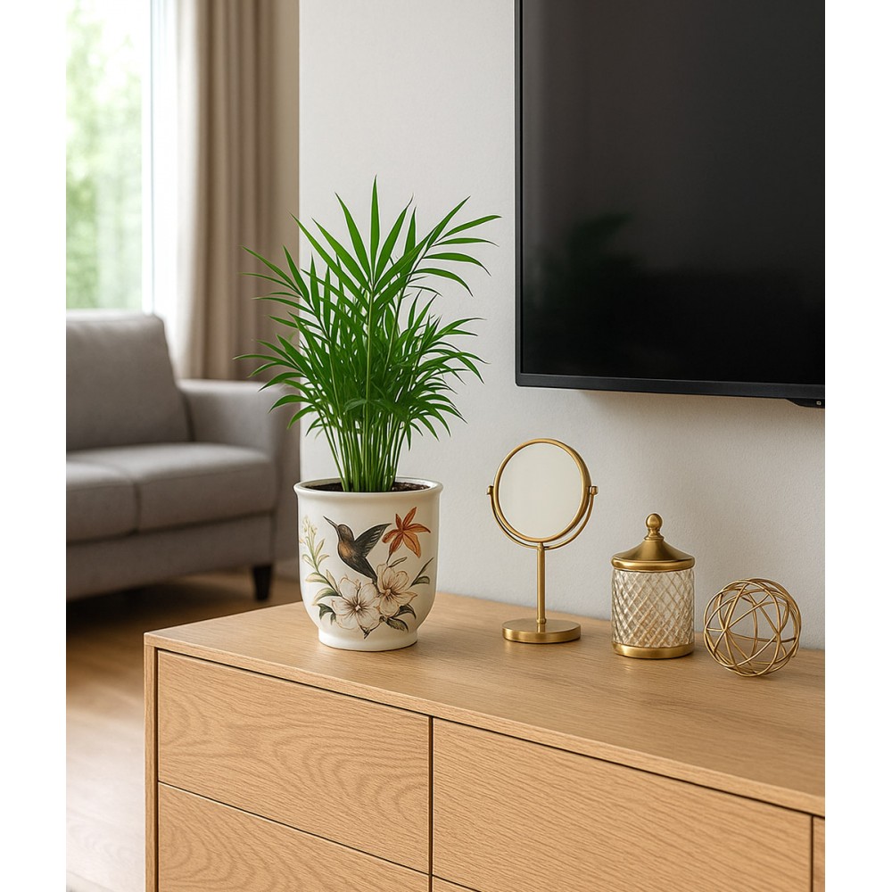 Wprowadź do swojego wnętrza odrobinę klasy i subtelnej elegancji dzięki wyjątkowej osłonce ceramicznej ozdobionej ręcznie malowanym motywem ptaków i kwiatów. To idealna dekoracja do salonów urządzonych w stylu klasycznym, angielskim, vintage lub cottage, która wspaniale podkreśli charakter roślin doniczkowych.