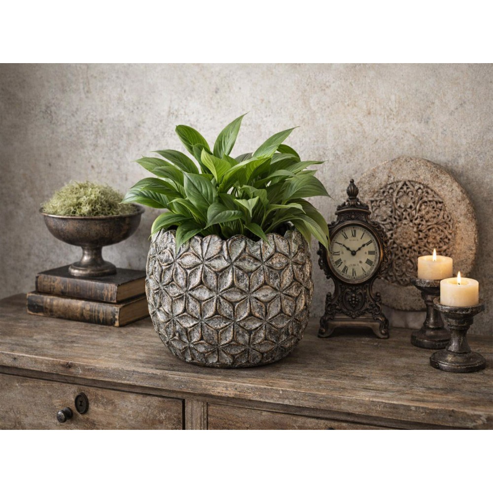 Dzięki swojej stabilności i wyrazistej fakturze osłonka staje się mocnym akcentem dekoracyjnym – świetnie prezentuje się na komodach, stolikach, parapetach oraz w przestrzeniach ogrodowych. To idealny wybór dla osób, które poszukują połączenia estetyki i trwałości.