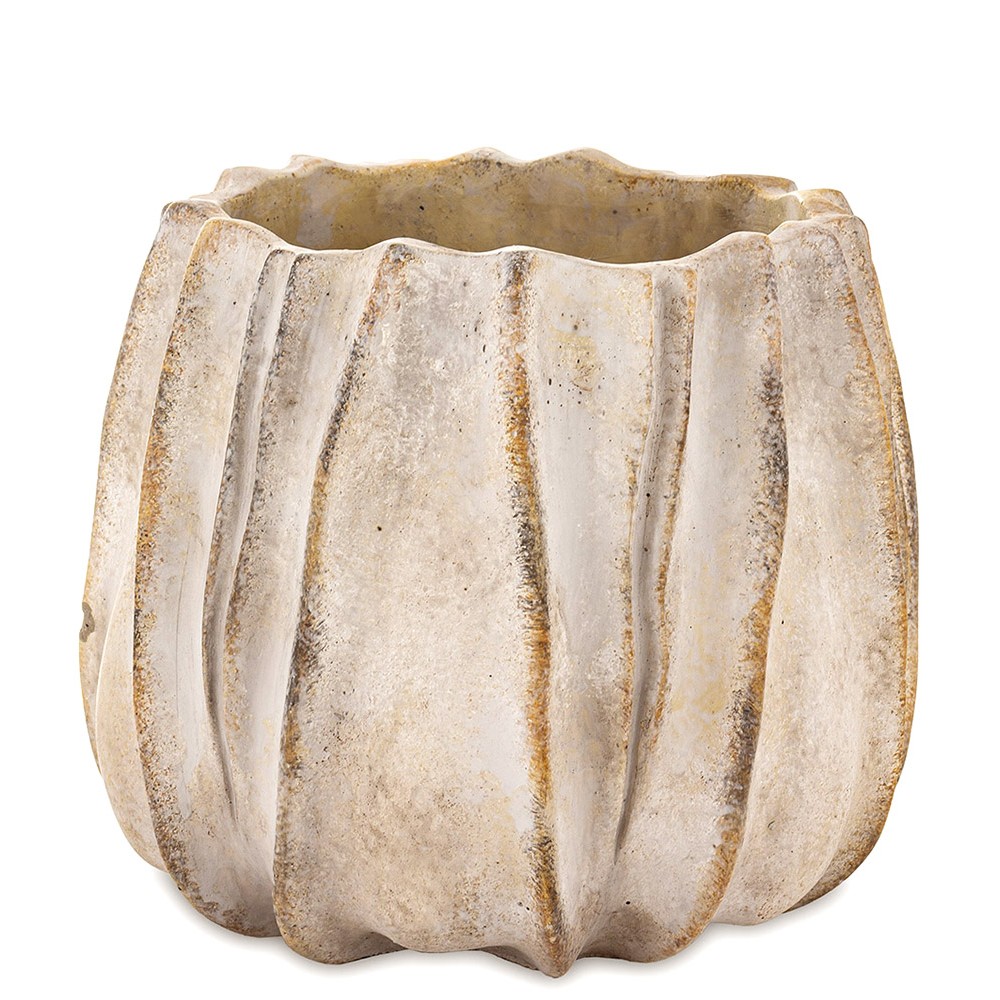 Przedstawiamy wyjątkową osłonkę cementową o wymiarach 18 × 19 cm, która zachwyca swoim organicznym kształtem i subtelnie postarzaną powierzchnią. Jej pionowe, falujące żłobienia tworzą efekt miękkiej, rzeźbiarskiej formy, która doskonale odnajdzie się zarówno w nowoczesnych, jak i klasycznych aranżacjach wnętrz.