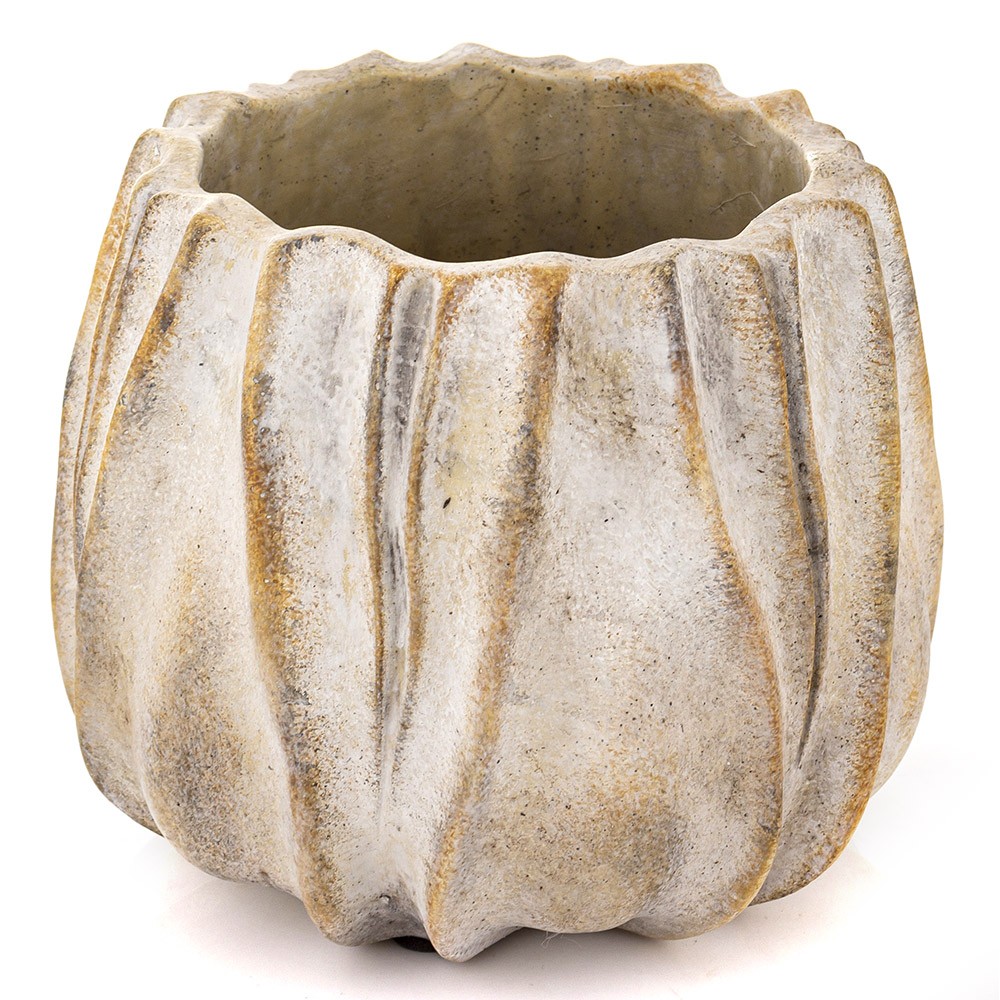 Przedstawiamy wyjątkową osłonkę cementową o wymiarach 15 × 16 cm, która zachwyca swoim organicznym kształtem i subtelnie postarzaną powierzchnią. Jej pionowe, falujące żłobienia tworzą efekt miękkiej, rzeźbiarskiej formy, która doskonale odnajdzie się zarówno w nowoczesnych, jak i klasycznych aranżacjach wnętrz.