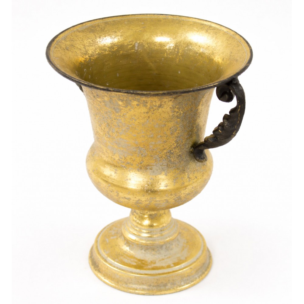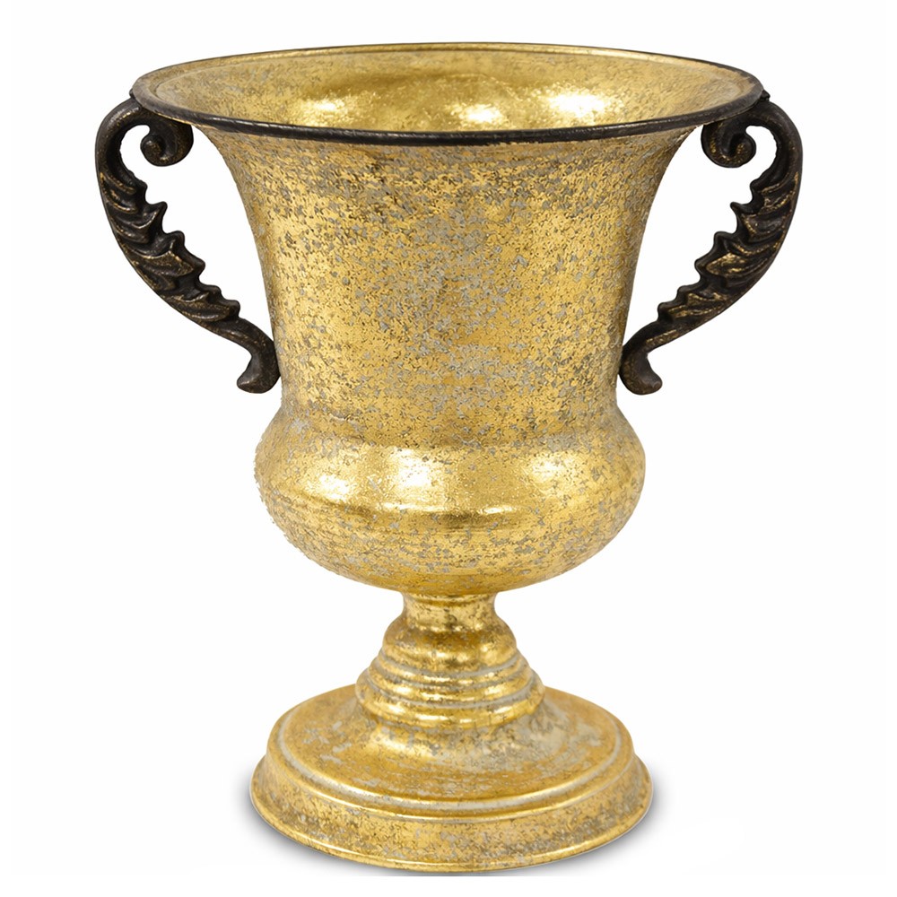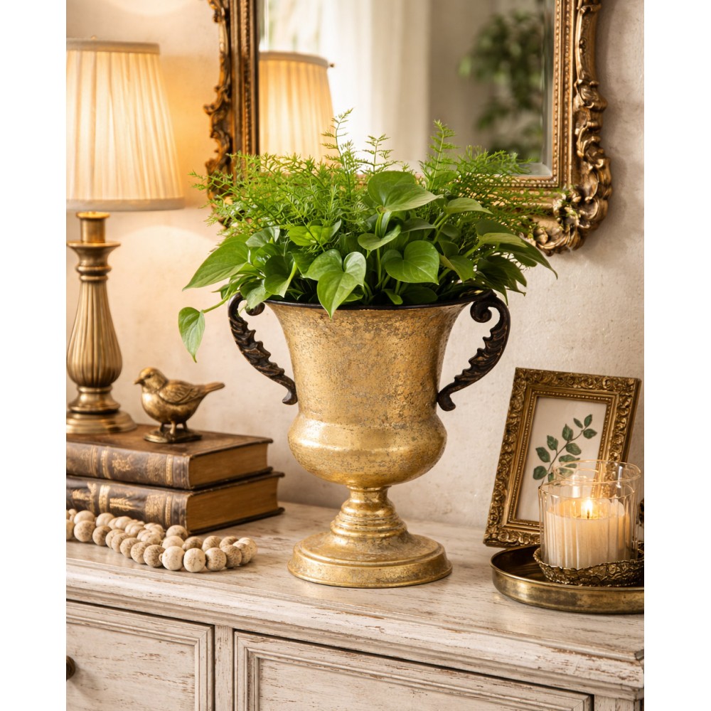 Elegancka osłonka dekoracyjna o klasycznej, pucharowej formie, która przyciąga wzrok stylowym wykończeniem w kolorze postarzanego złota. Subtelnie nieregularna powierzchnia nadaje jej wyjątkowego, szlachetnego charakteru, a ozdobne uchwyty po bokach podkreślają klasyczny i ponadczasowy styl.