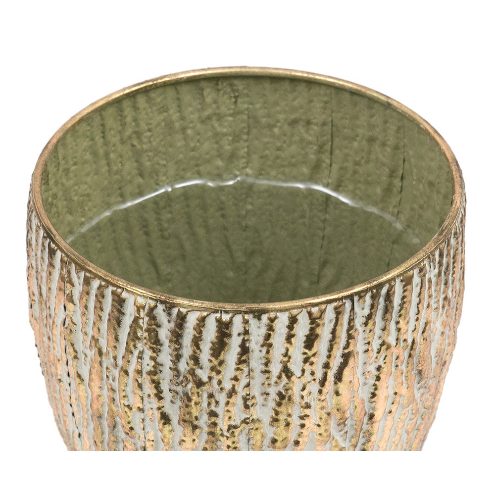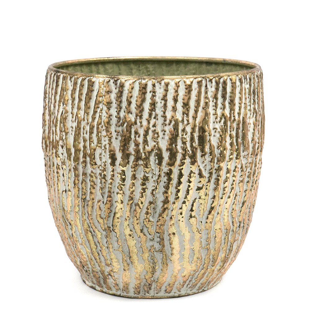 Niespotykana doniczka / osłonka okrągła wykonana z metalu w kolorze złotym. Jej nieprzeciętny design sprawi, że będzie pięknie się prezentowała w Twoim domu a dzięki swojemu zdobieniu, będzie bardzo estetycznym dodatkiem. Jej unikalna, geometryczna struktura nadają stylowego charakteru i sprawiają, że doskonale prezentuje się w nowoczesnych wnętrzach, w stylowych pomieszczeniach jak i również w ogrodzie zimowym. Doskonała do eksponowania kwiatów i kompozycji roślinnych. Nie posiada otworu do odpływu wody. Idealna dla miłośników niespotykanych dekoracji.