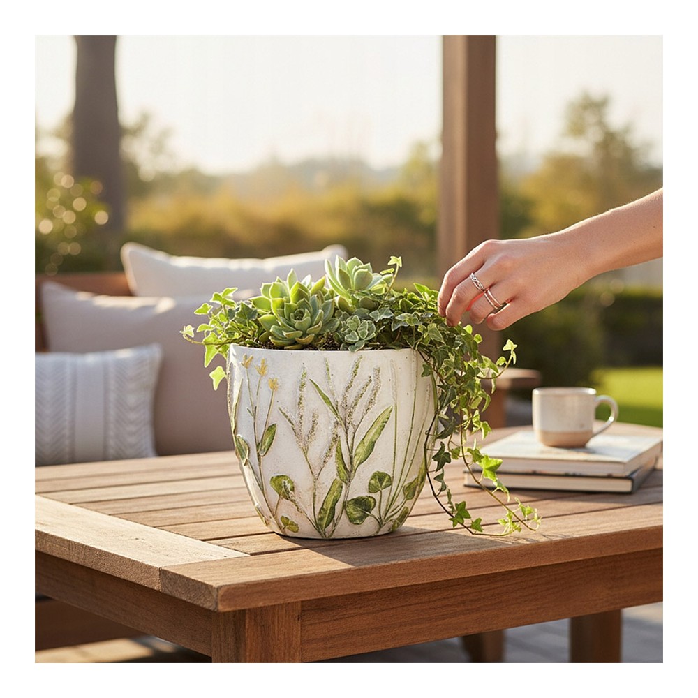 Każdy egzemplarz jest unikatowy, dzięki ręcznemu wykończeniu i delikatnym różnicom w fakturze oraz zdobieniach. Idealnie sprawdzi się jako osłonka na rośliny doniczkowe, zioła lub jako samodzielna dekoracja wnętrza.
