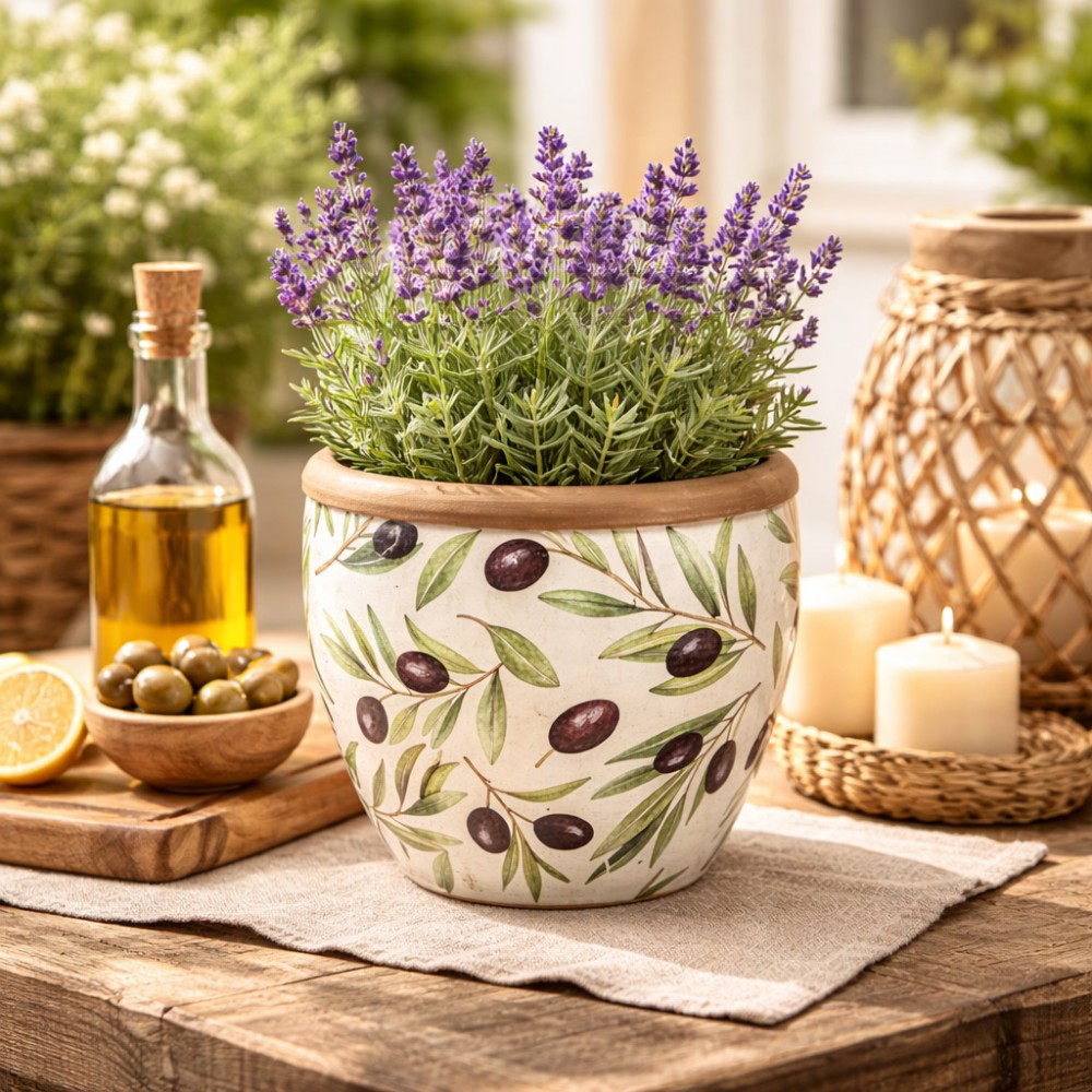 Wprowadź do swojego wnętrza wyjątkowy klimat południa Europy! Ta dekoracyjna osłonka z motywem oliwek zachwyca naturalnym wzornictwem i subtelną kolorystyką, która doskonale komponuje się zarówno z zielenią roślin, jak i jasnymi, przytulnymi wnętrzami.