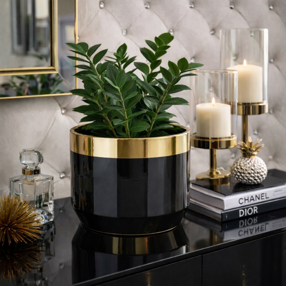 Inspirując się stylem glamour, osłonka została ozdobiona delikatnym złotym paskiem, który nadaje jej wyjątkowego charakteru i ciepłej atmosfery. Dodaj wnętrzu charakteru dzięki tej efektownej osłonce w nowoczesnym stylu! Zachwyca subtelnym, połyskującym wykończeniem. Idealna jako dekoracja, świetnie prezentuje się solo lub z ulubioną rośliną.