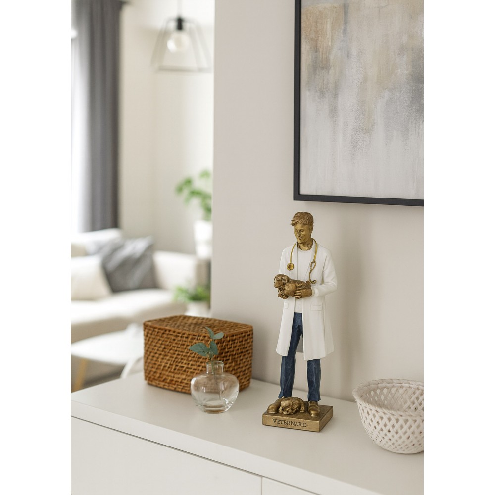 Oryginalna figurka z wizerunkiem mężczyzny weterynarza. Została wykonana z polyresinu, jest w kolorze białym, złotym i niebieskim. To wyjątkowa dekoracja, która zachwyca imponującym wyglądem i dbałością o detale. Dzięki swoim wymiarom idealnie sprawdzi się w roli ozdoby na półce lub komodzie. Wyjątkowy odcień koloru sprawia, że figurka przyciąga wzrok i jest doskonałym wyborem na prezent lub jako unikalny element dekoracyjny do wnętrza. To idealna propozycja dla osób poszukujących wyjątkowych dodatków do swojego domu. Sprawdzi się jako ozdoba mieszkania w stylu klasycznym, jak i nowoczesnym. Jej niepowtarzalny design sprawi że nikt nie przejdzie obok niej obojętnie.