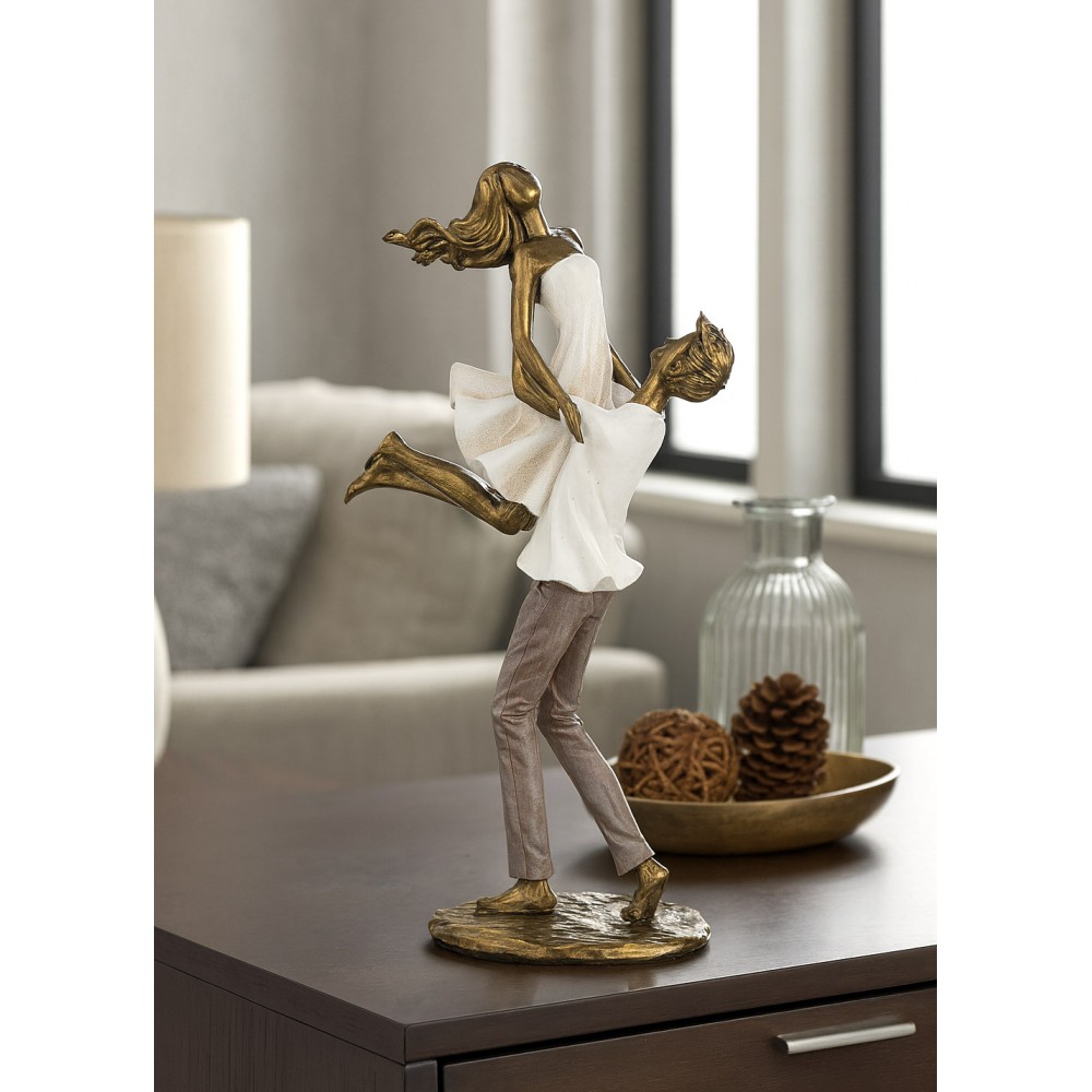 Wyjątkowa figurka przedstawiająca romantyczną scenę uniesienia to symbol radości, bliskości i pełnego energii uczucia. Mężczyzna przytula i podnosi kobietę wysoko nad ziemią, a jej lekko rozwiane włosy i falująca sukienka nadają kompozycji dynamiki oraz lekkości. Całość wykonana jest w eleganckiej stylistyce – ciepłe, złociste wykończenie postaci oraz białe elementy ubioru tworzą harmonijną i ponadczasową dekorację.