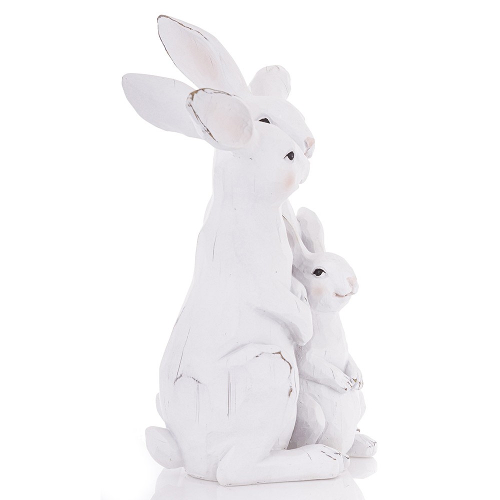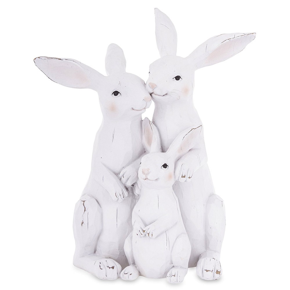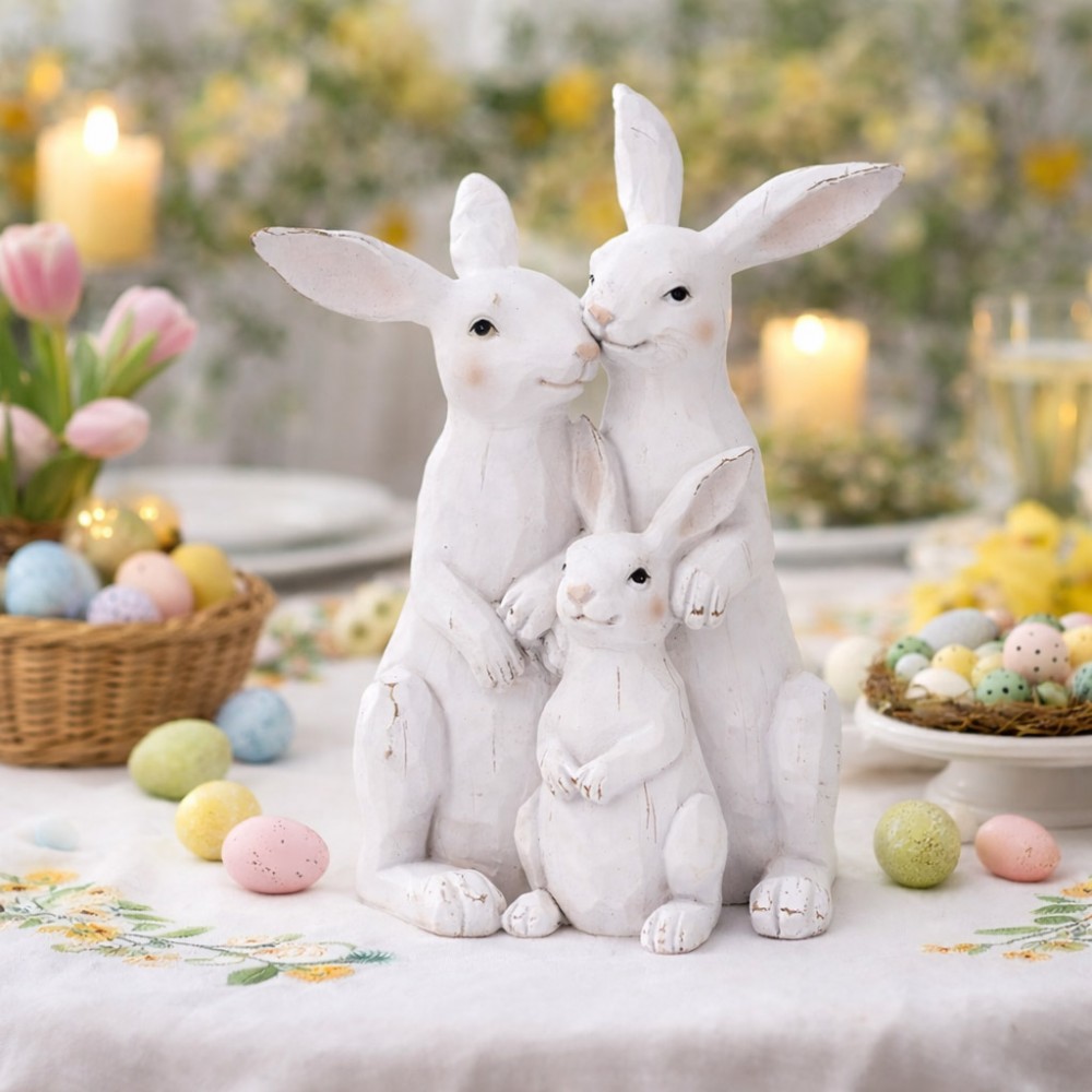 Urocza figurka przedstawiająca rodzinę zajączków to wyjątkowa dekoracja, która wprowadzi do wnętrza ciepłą, wiosenną i wielkanocną atmosferę. Subtelne detale, delikatne przetarcia oraz klasyczna biel nadają jej rustykalnego, a jednocześnie eleganckiego charakteru.