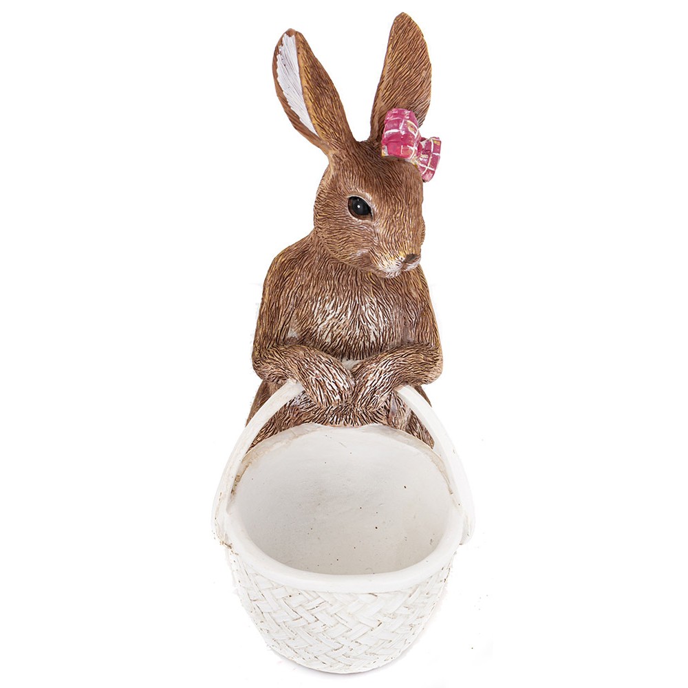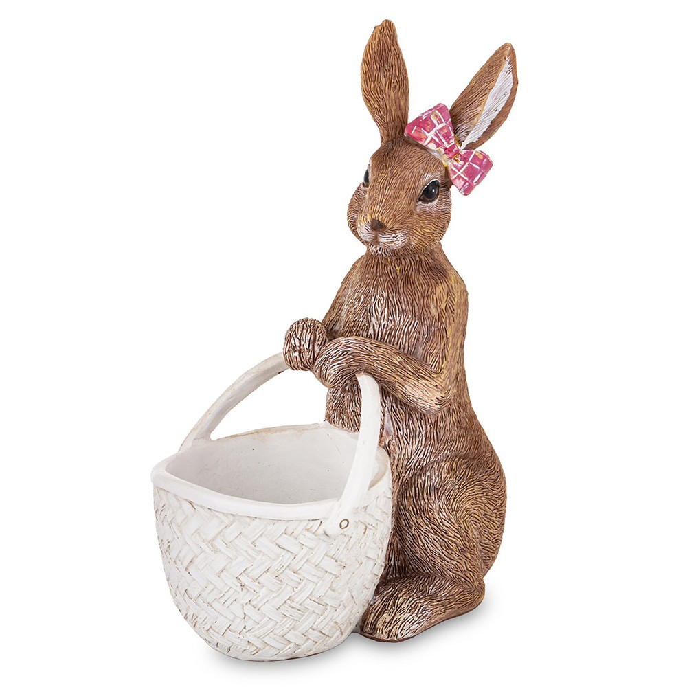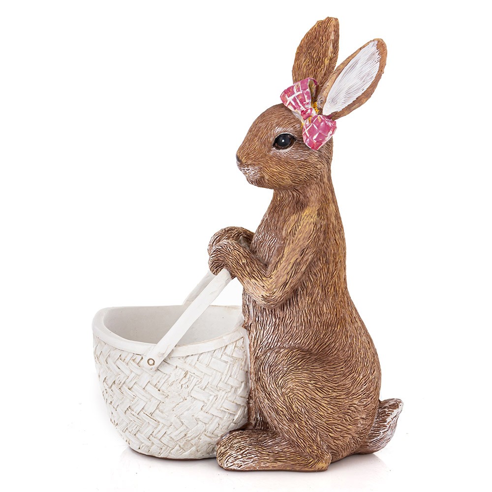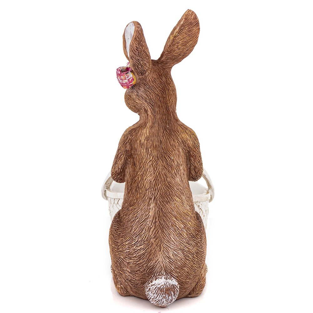 Koszyczek umieszczony z przodu figurki pełni funkcję praktycznej miseczki – idealnej na wielkanocne słodycze, drobne dekoracje lub do posadzenia rzeżuchy czy innych małych roślin. Dzięki temu figurka łączy funkcję ozdobną z użytkową.