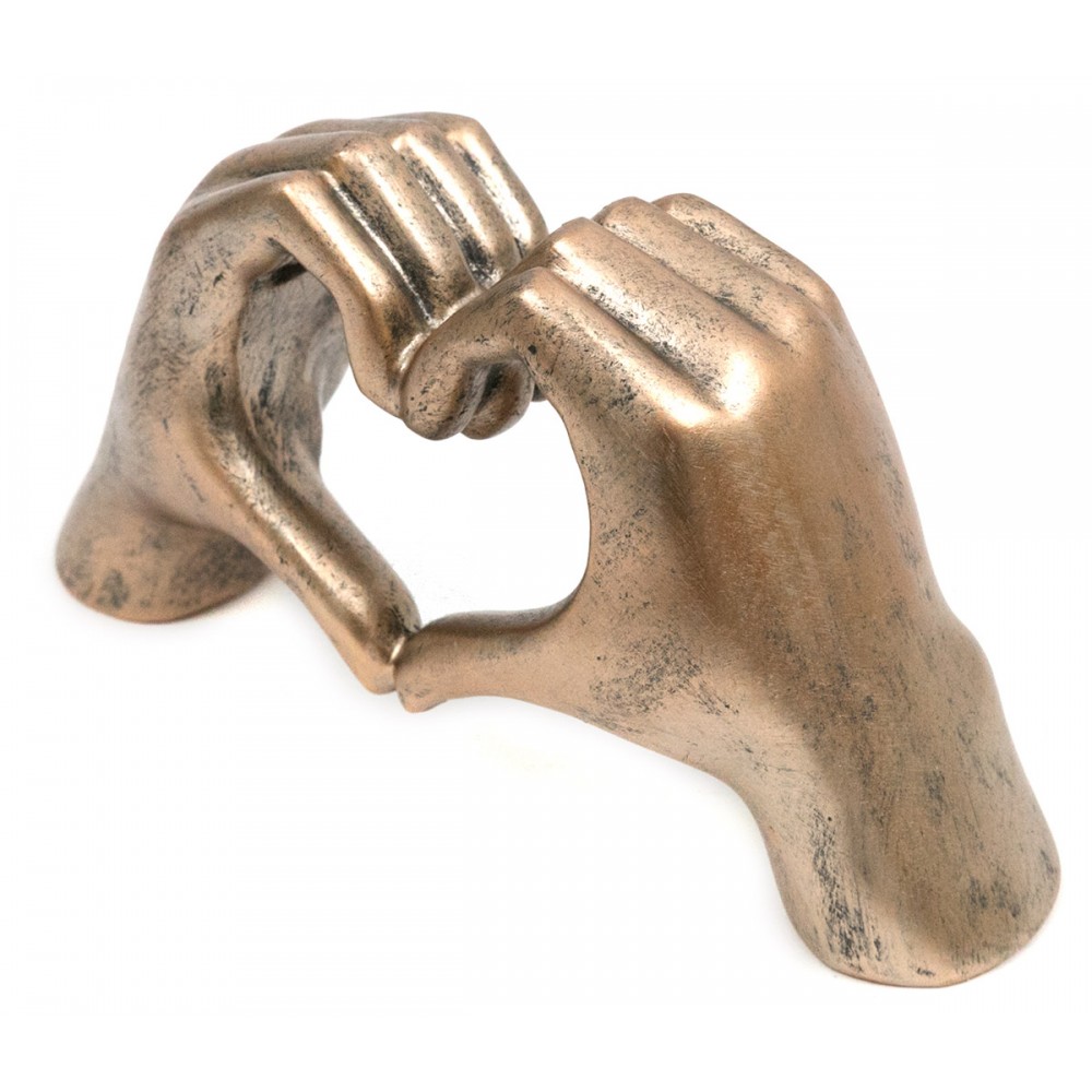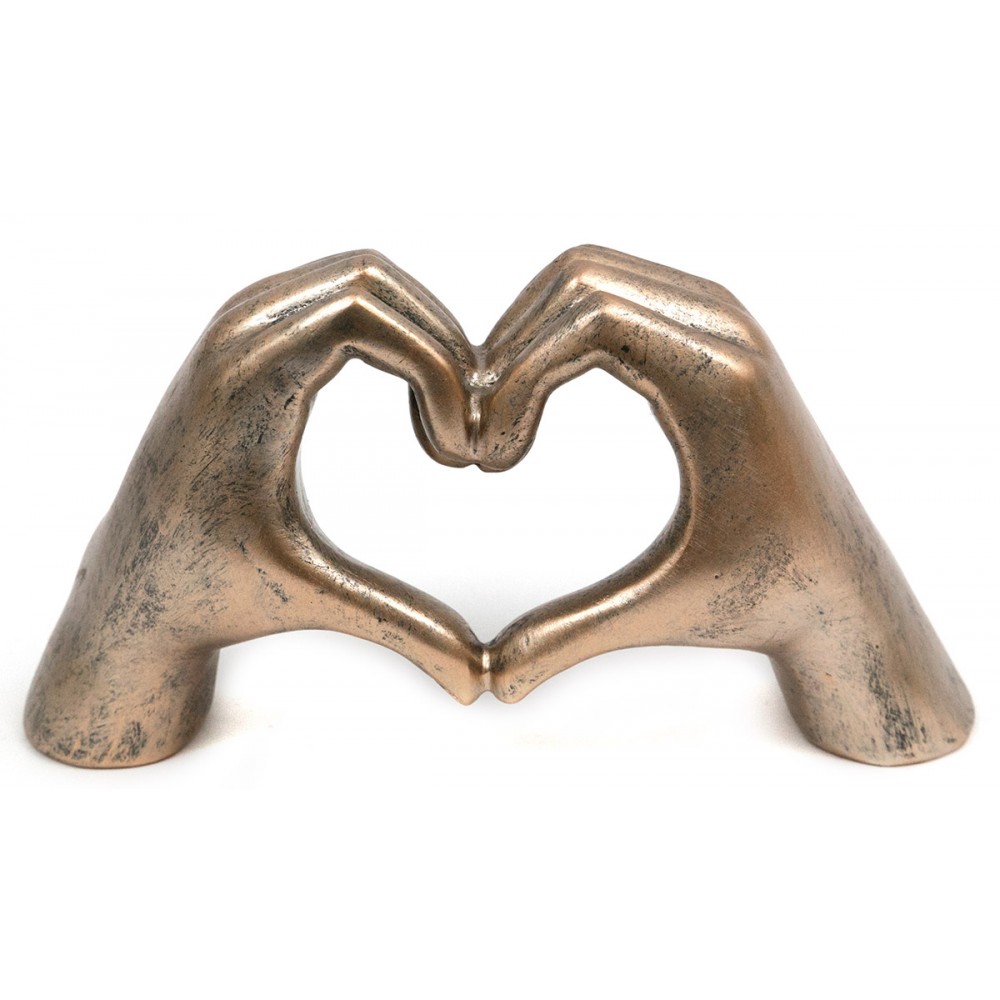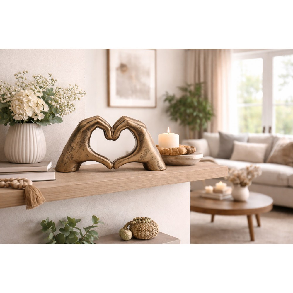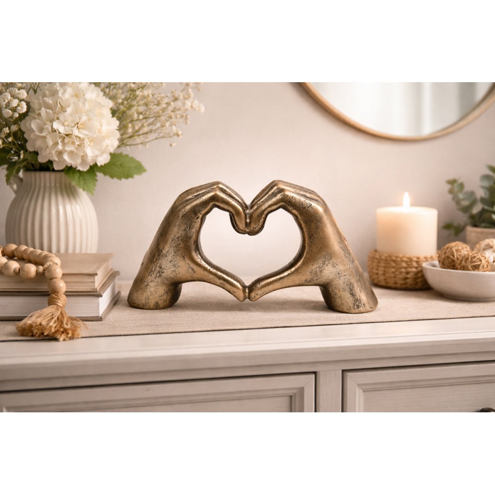 Wyjątkowa figurka dekoracyjna przedstawiająca dłonie układające się w kształt serca — symbol bliskości, miłości i pozytywnej energii. Stylowe wykończenie w odcieniu postarzanego złota nadaje jej elegancki i nowoczesny charakter, dzięki czemu świetnie sprawdzi się jako ozdoba salonu, sypialni, biura czy jako pomysł na prezent.