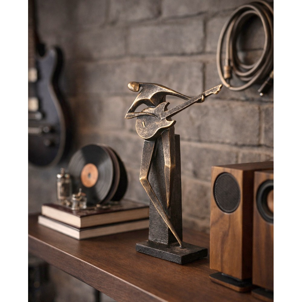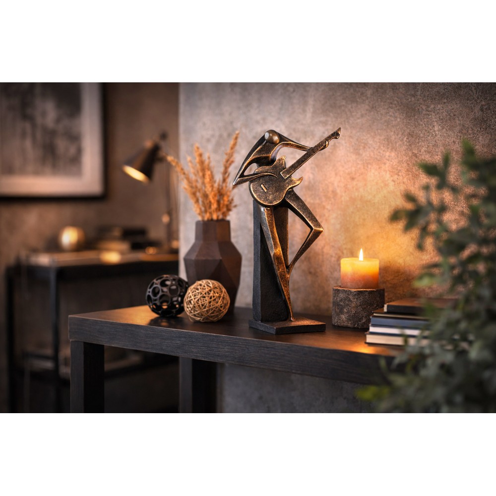 Efektowna figurka dekoracyjna przedstawiająca abstrakcyjną postać gitarzysty, która doskonale podkreśli charakter wnętrz w stylu nowoczesnym, loftowym lub muzycznym. Dynamiczna forma oraz wykończenie w odcieniu postarzanego metalu nadają jej artystycznego wyrazu i sprawiają, że przyciąga wzrok jako oryginalny element wystroju.