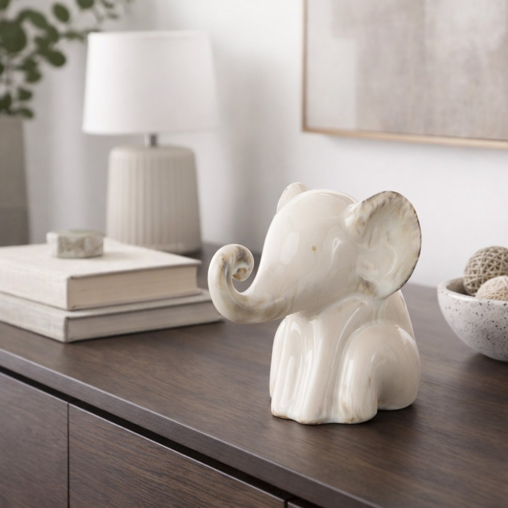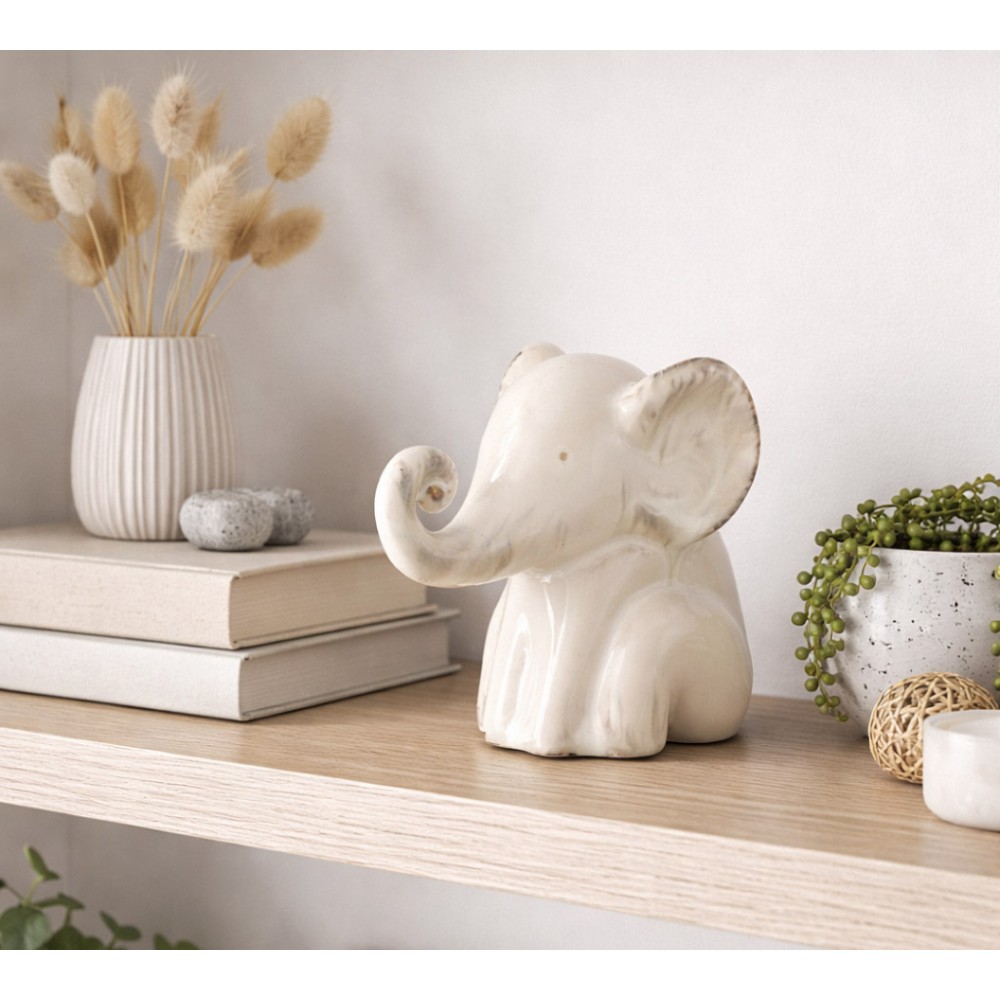 Elegancka figurka ceramicznego słonika to subtelna i stylowa ozdoba, która doskonale uzupełni aranżację każdego wnętrza. Jasna kolorystyka z delikatnymi przetarciami nadaje figurce wyjątkowego charakteru i sprawia, że świetnie komponuje się zarówno z klasycznymi, jak i nowoczesnymi dekoracjami.