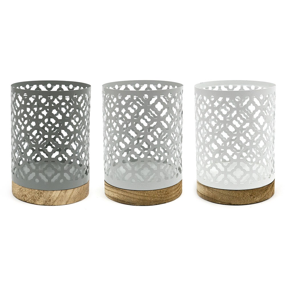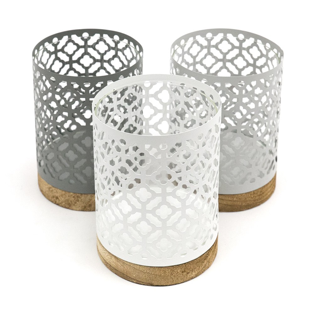 Stylowy zestaw trzech ażurowych świeczników wykonanych z metalu i osadzonych na solidnej, naturalnej drewnianej podstawie to idealna propozycja dla miłośników dekoracji łączących elegancję z przytulnym klimatem. Każdy świecznik ma wymiary 17 × 10 cm, dzięki czemu pięknie prezentują się zarówno razem, jak i rozstawione w różnych miejscach wnętrza.