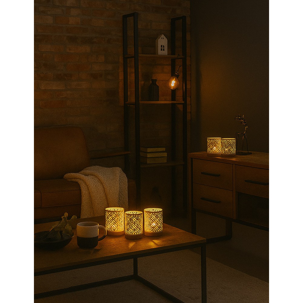 Ażurowy wzór wycinany laserowo tworzy wyjątkową grę światła po zapaleniu świecy, nadając pomieszczeniu ciepły, nastrojowy charakter. Komplet doskonale wpisuje się w aranżacje w stylu loft, nowoczesnym, rustykalnym, skandynawskim oraz boho.