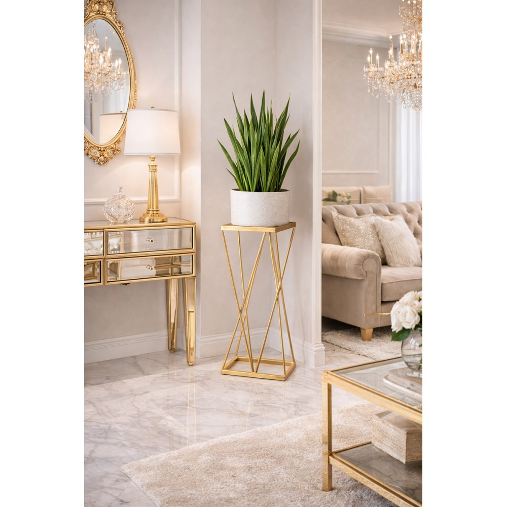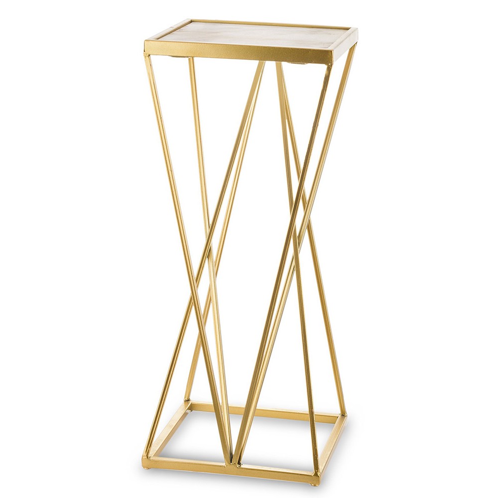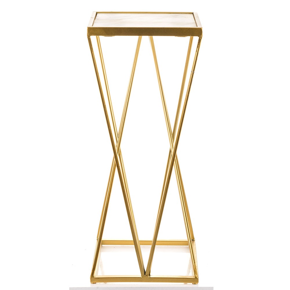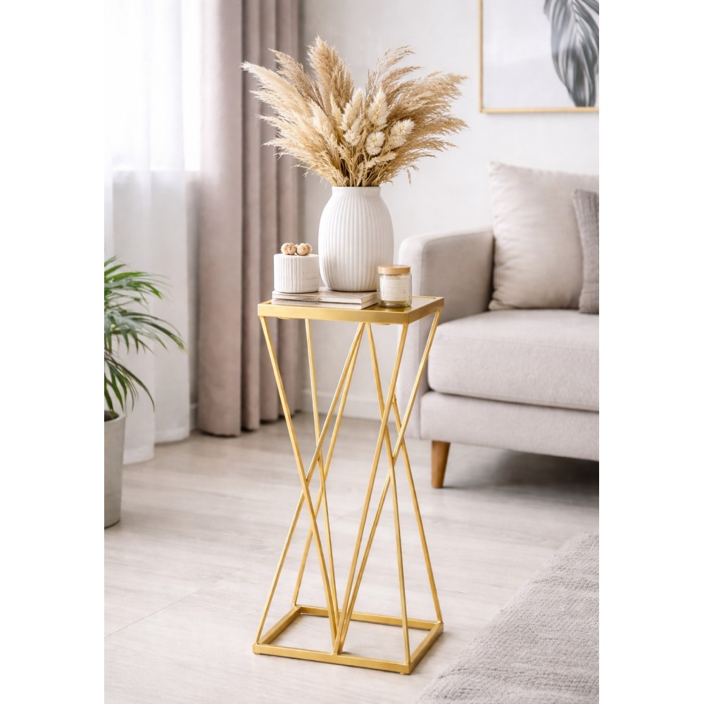 Elegancki stojak na kwiaty o nowoczesnej, geometrycznej formie, który doskonale podkreśli charakter każdego wnętrza. Złota metalowa konstrukcja z blatem imitującym marmur nadaje mu lekkości wizualnej i sprawia, że świetnie sprawdzi się zarówno jako stojak na rośliny, jak i dekoracyjny postument na dodatki wnętrzarskie.
