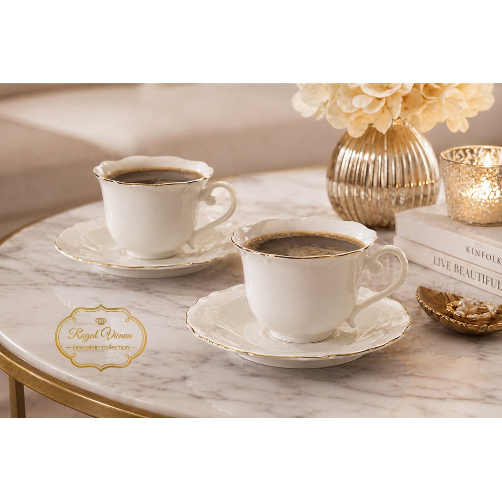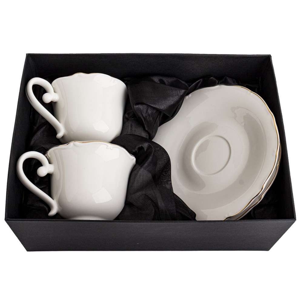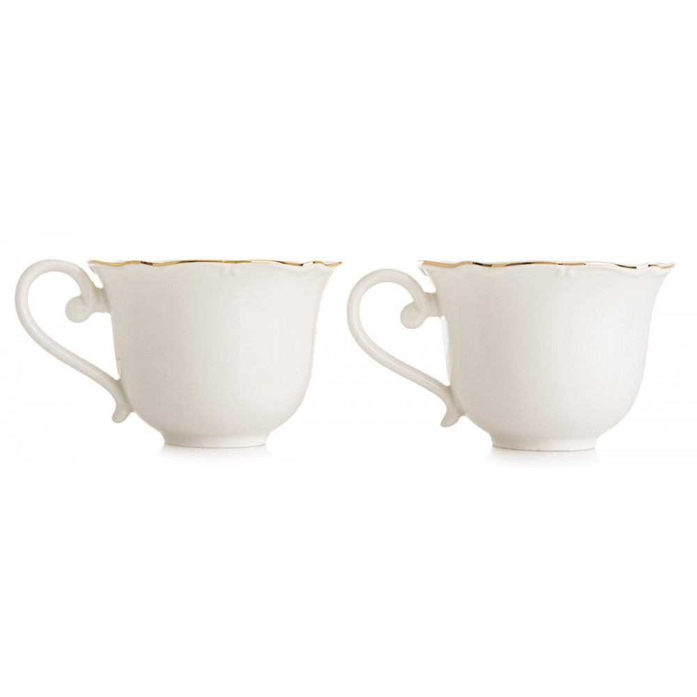 Wyjątkowy komplet dwóch filiżanek z podstawkami to propozycja dla osób ceniących klasykę i subtelną elegancję. Wykonane z wysokiej jakości porcelany filiżanki zachwycają białym odcieniem oraz ozdobnym złotym rantem, który nadaje im luksusowego charakteru.