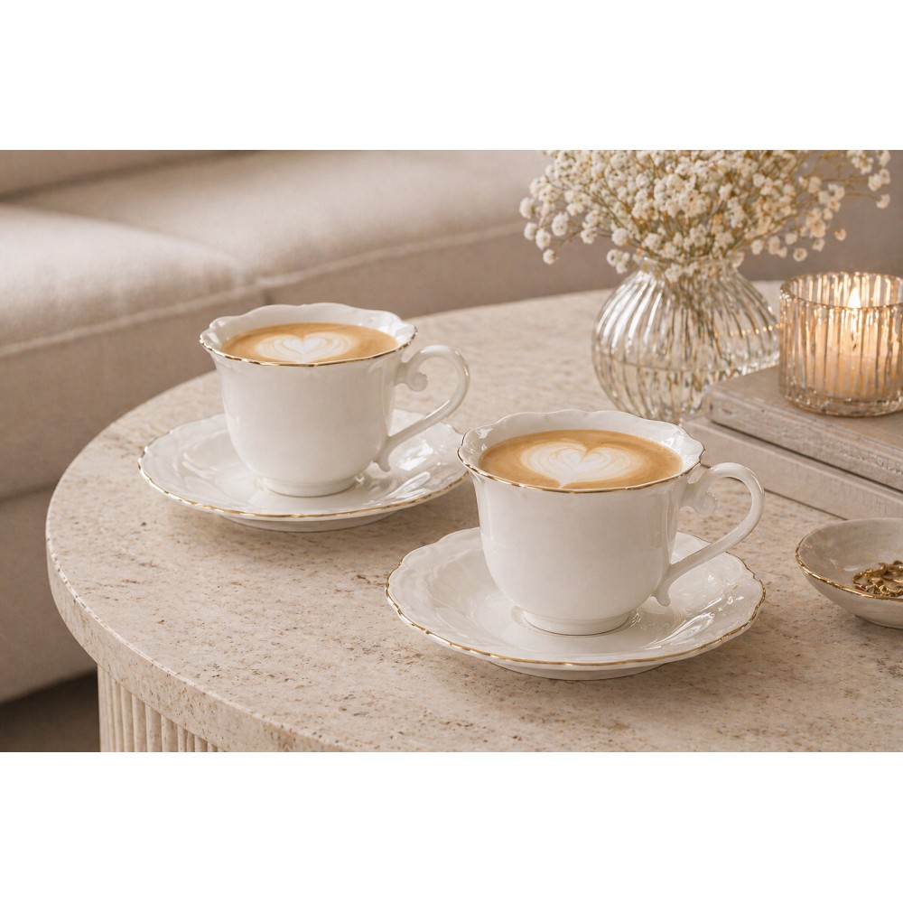 Filiżanki posiadają lekko falowany brzeg oraz wygodne ucho, dzięki czemu są nie tylko piękne, ale i komfortowe w użytkowaniu. Idealnie sprawdzą się do serwowania kawy, herbaty lub innych ulubionych napojów – zarówno na co dzień, jak i podczas spotkań z gośćmi.