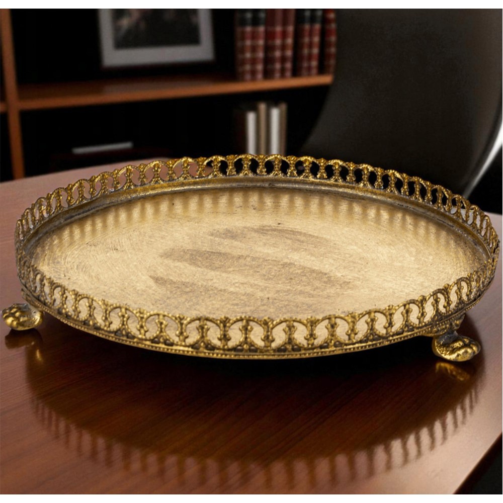 Elegancka patera z kloszem w stylu retro vintage to wyjątkowy element dekoracyjny, który doda klasy każdemu wnętrzu. Wykonana z metalu w odcieniu starego złota i szkła, zachwyca kunsztownym wykończeniem oraz subtelnymi detalami. Ozdobny rant o finezyjnym wzorze i nóżki w stylu antycznym nadają jej niepowtarzalnego charakteru.