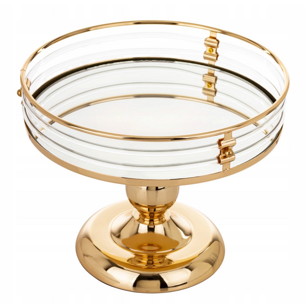 Elegancka patera z blatem z lustra to wyjątkowy element dekoracyjny, który doda klasy i blasku każdemu wnętrzu. Wykonana z połączenia metalu w kolorze złotym oraz lustrzanej tafli, zachwyca swoim luksusowym wyglądem i perfekcyjnym wykończeniem.
