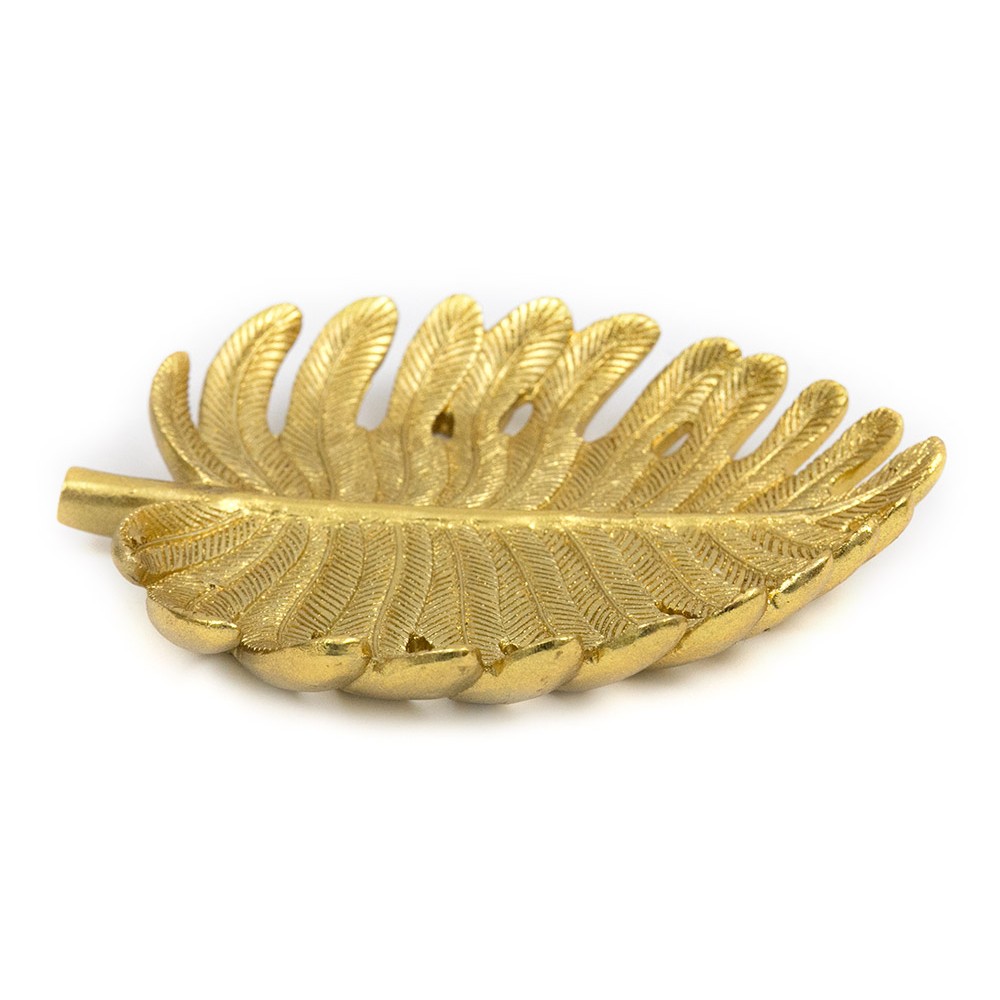 Elegancka patera dekoracyjna wykonana z trwałego polyresinu to stylowy dodatek, który przyciąga uwagę swoim wyjątkowym kształtem i złotym wykończeniem. Projekt inspirowany jest liściem palmy — charakterystyczny podłużny kształt oraz ażurowe wcięcia oddają egzotyczny, tropikalny charakter tej rośliny.
