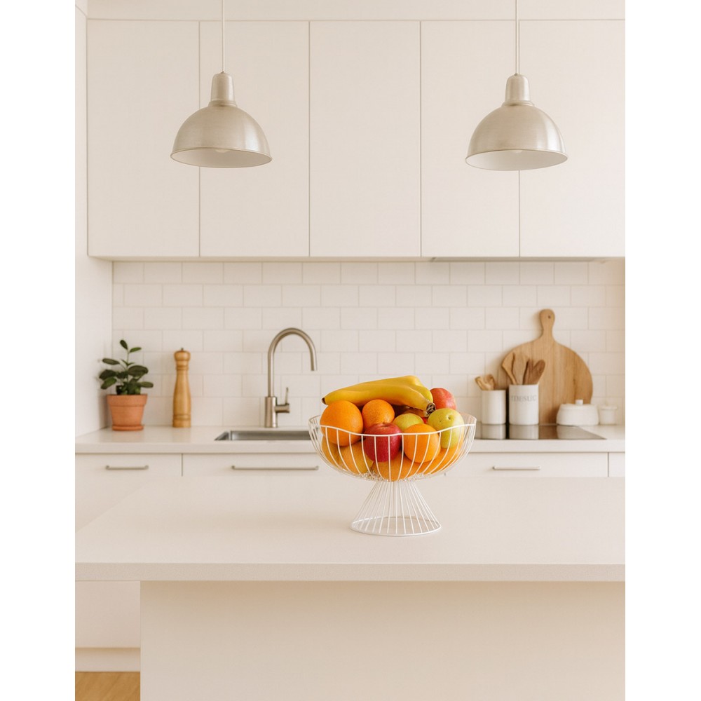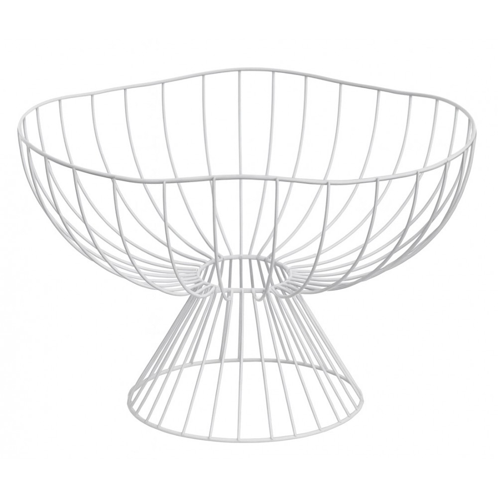 Stylowa patera wykonana z metalu malowanego proszkowo na elegancki biały kolor. Jej wyjątkowy charakter podkreśla nieregularny górny rant, który nadaje całości designerskiego i nowoczesnego wyglądu. Osadzona na stabilnej nóżce, prezentuje się lekko i efektownie, idealnie eksponując owoce lub dekoracje.