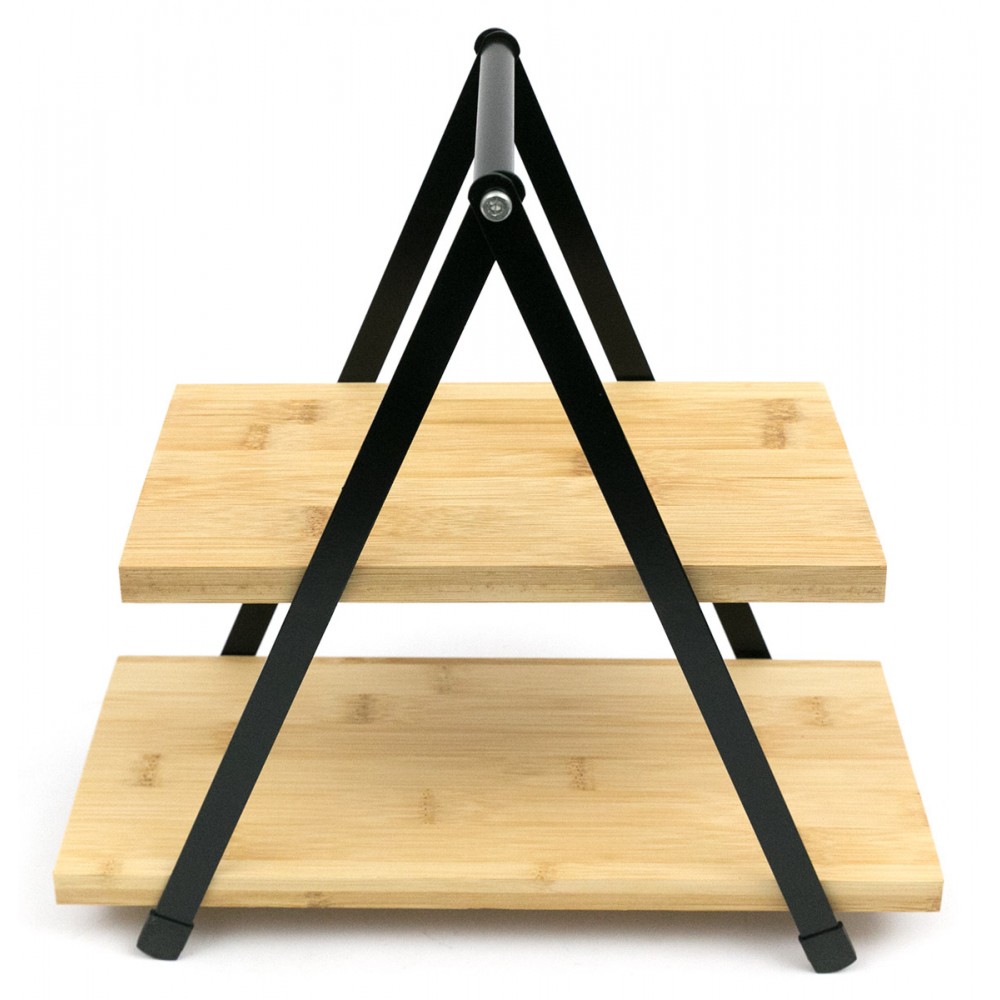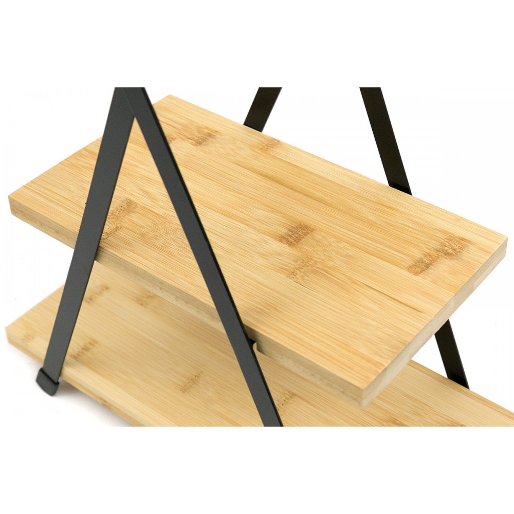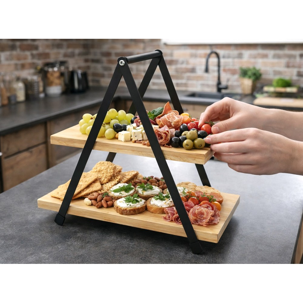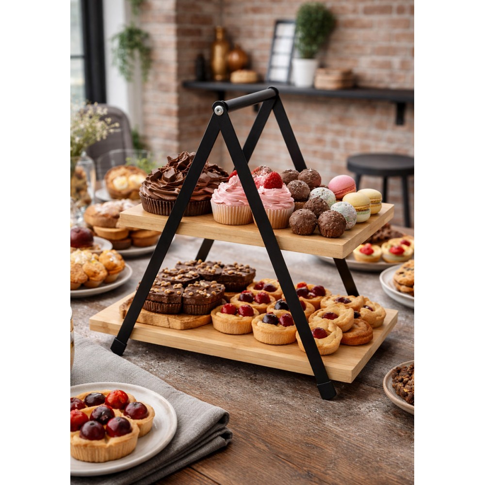 Stylowa i funkcjonalna patera dwupoziomowa łącząca naturalne drewno z metalową konstrukcją w czarnym, matowym wykończeniu. Idealna do serwowania przekąsek, słodkości, owoców lub jako dekoracyjna ekspozycja produktów i dodatków wnętrzarskich. Doskonale sprawdzi się w kuchni, salonie, kawiarni czy podczas przyjęć.