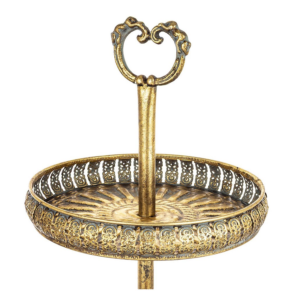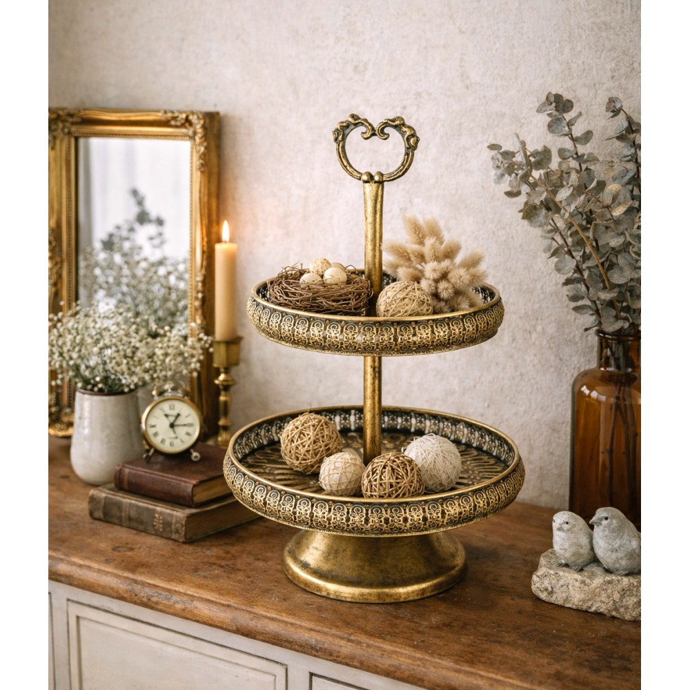 Efektowna, dwupoziomowa patera dekoracyjna wykonana w stylu postarzanego metalu, która stanowi elegancki element aranżacji wnętrza. Bogato zdobione detale oraz dekoracyjny uchwyt nadają jej klasyczny, pałacowy charakter i sprawiają, że doskonale sprawdzi się jako ozdoba stołu, komody lub konsoli.