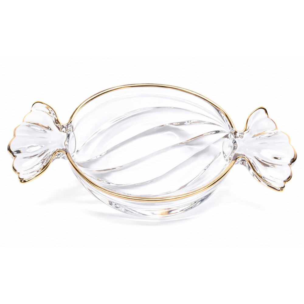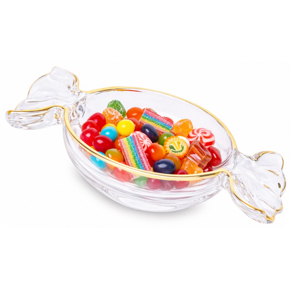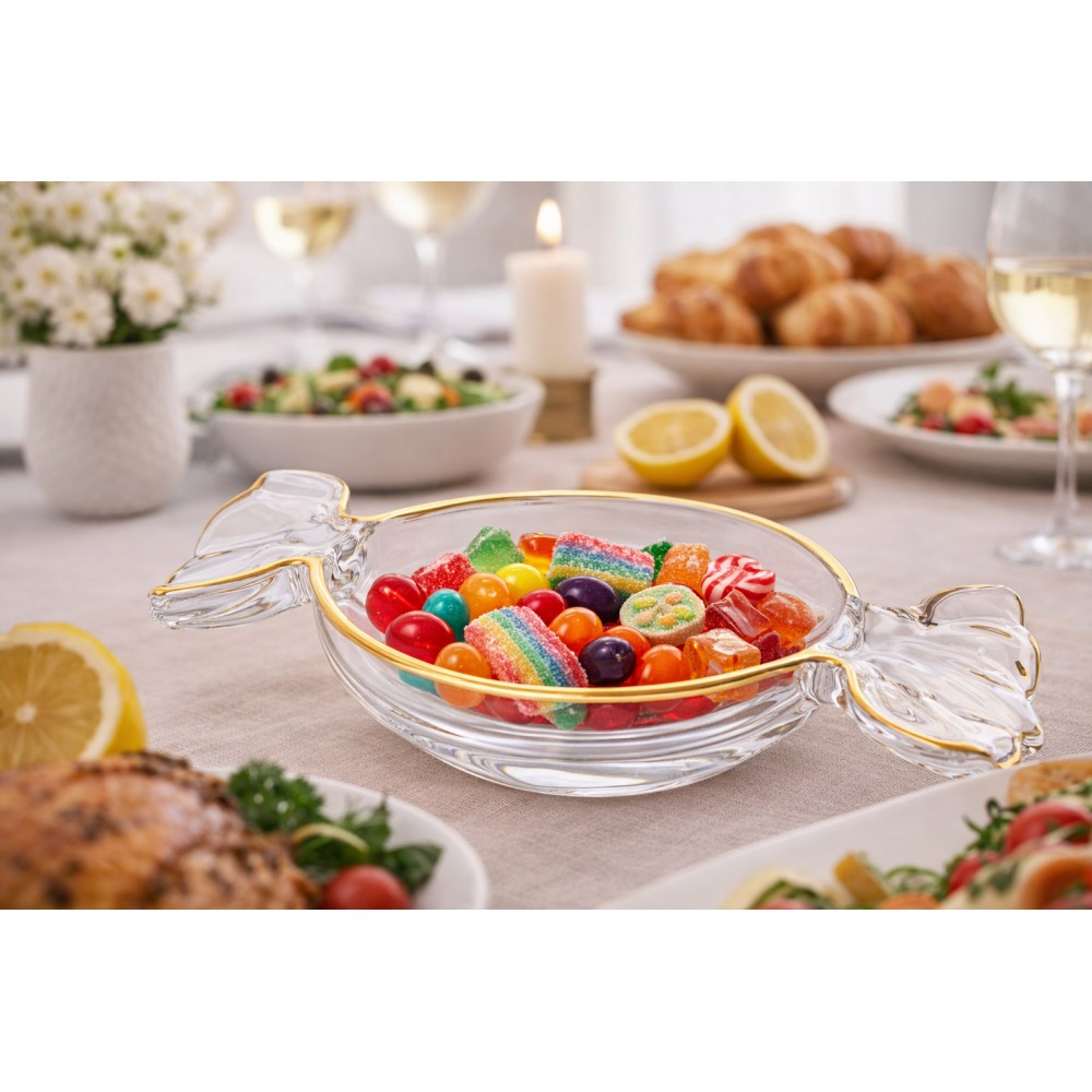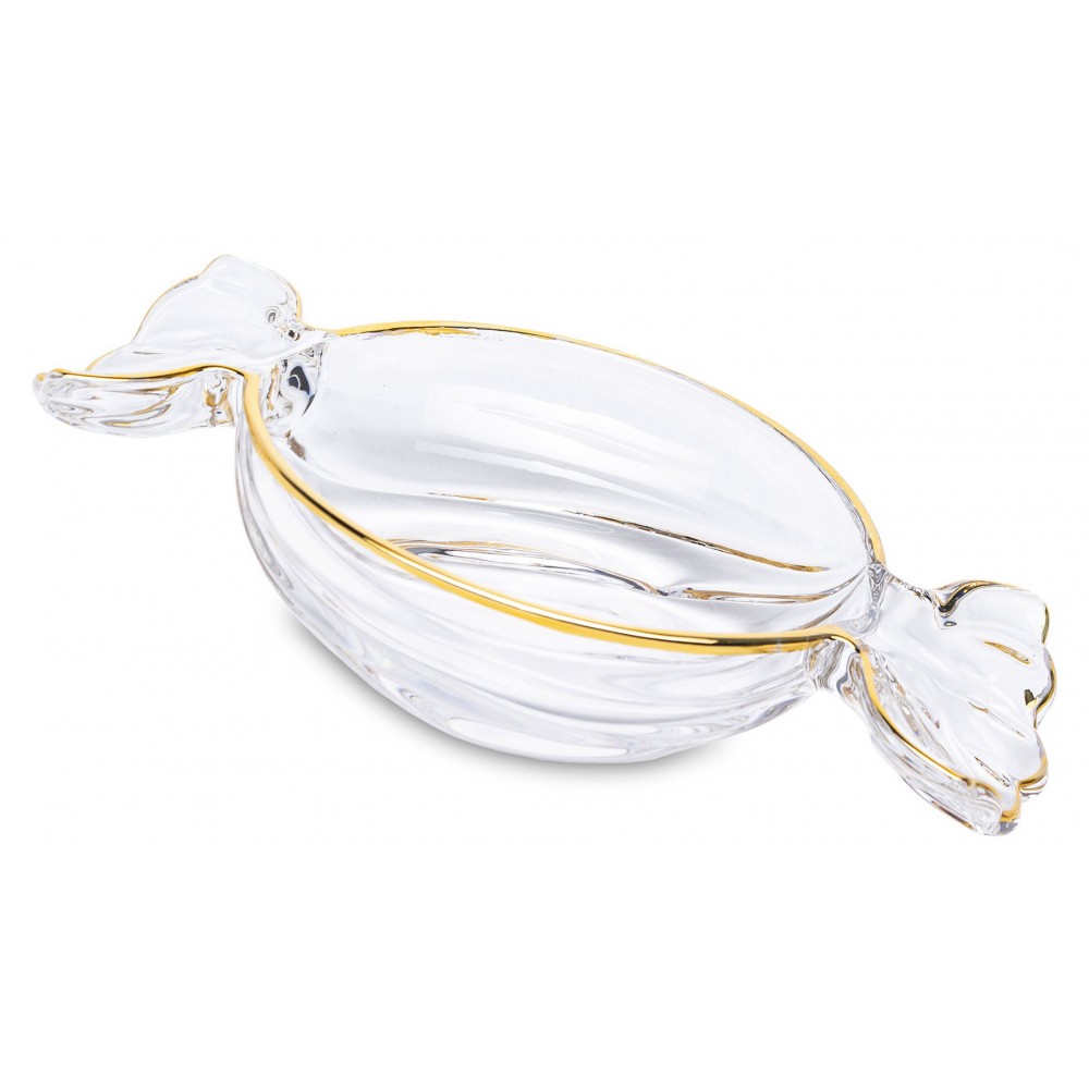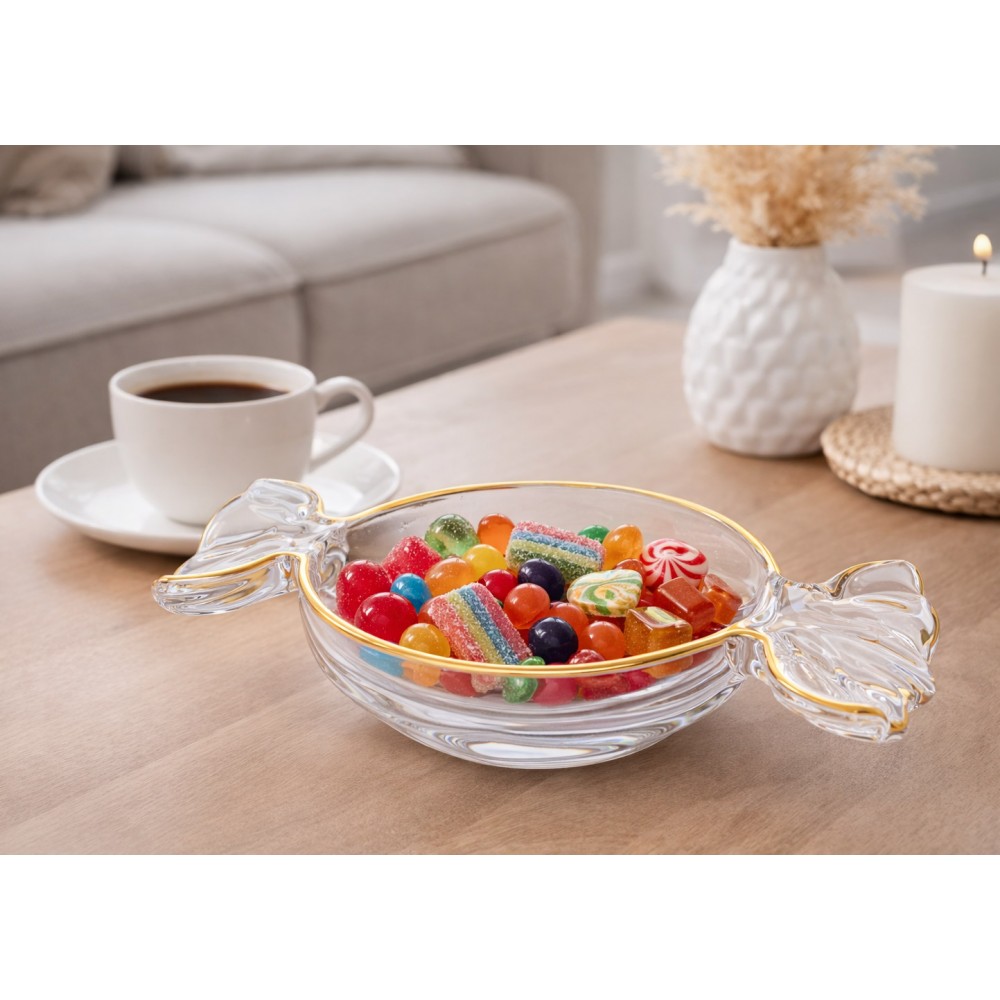 Elegancka patera w kształcie cukierka o wymiarach 5x25x15cm, łącząca nowoczesny design z ponadczasową klasyką. Jej ponadczasowy design sprawi, że będzie pasowała do każdej nowoczesnej zastawy a dzięki swojemu zdobieniu będzie bardzo widocznym dodatkiem. Szklany talerz, zdobiony złotymi akcentami, nadaje całości luksusowego charakteru. Idealna do serwowania słodyczy lub cukierków podczas spotkań rodzinnych i przyjęć. Stanowi również wyjątkowy element dekoracyjny, który doda szyku każdemu wnętrzu. Znajdzie wiele zastosowań, dlatego przyda się w każdym domu. Posiada gładką powierzchnie co ułatwia jej mycie lub czyszczenie.