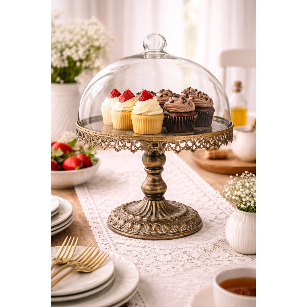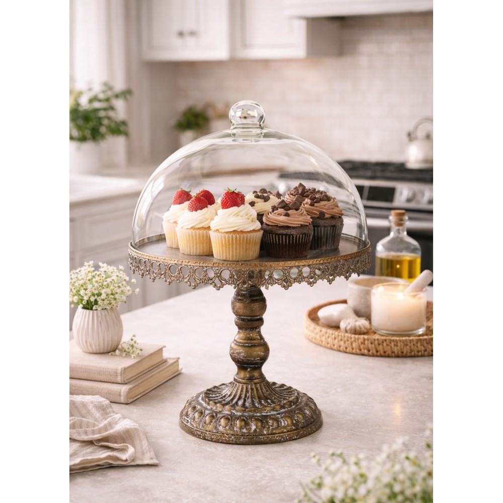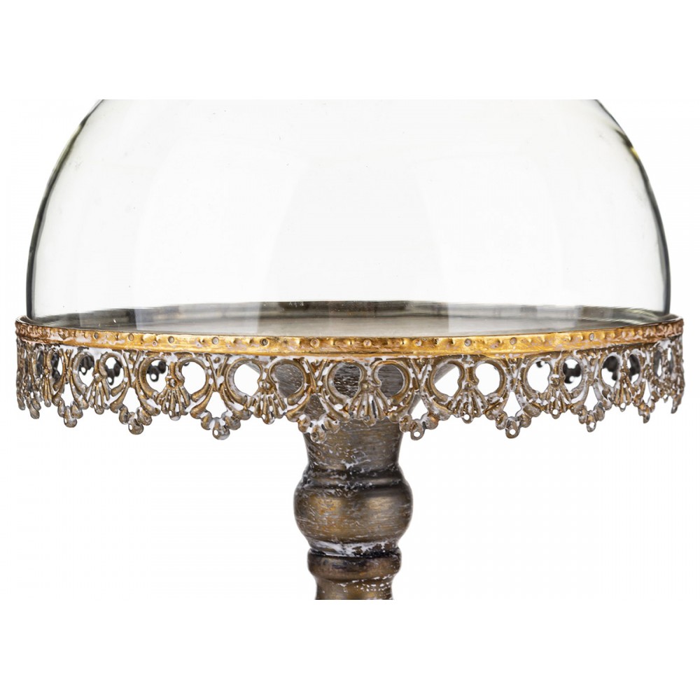Stylowa patera dekoracyjna z metalową podstawą i szklanym kloszem to wyjątkowy element wyposażenia kuchni i jadalni. Elegancka forma na ozdobnej, postarzonej podstawie w połączeniu z dekoracyjnym rantem nadaje jej klasyczny i bardzo efektowny wygląd.