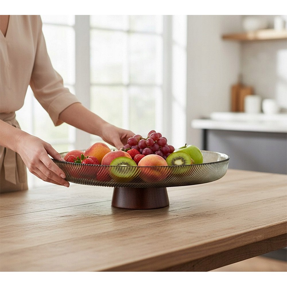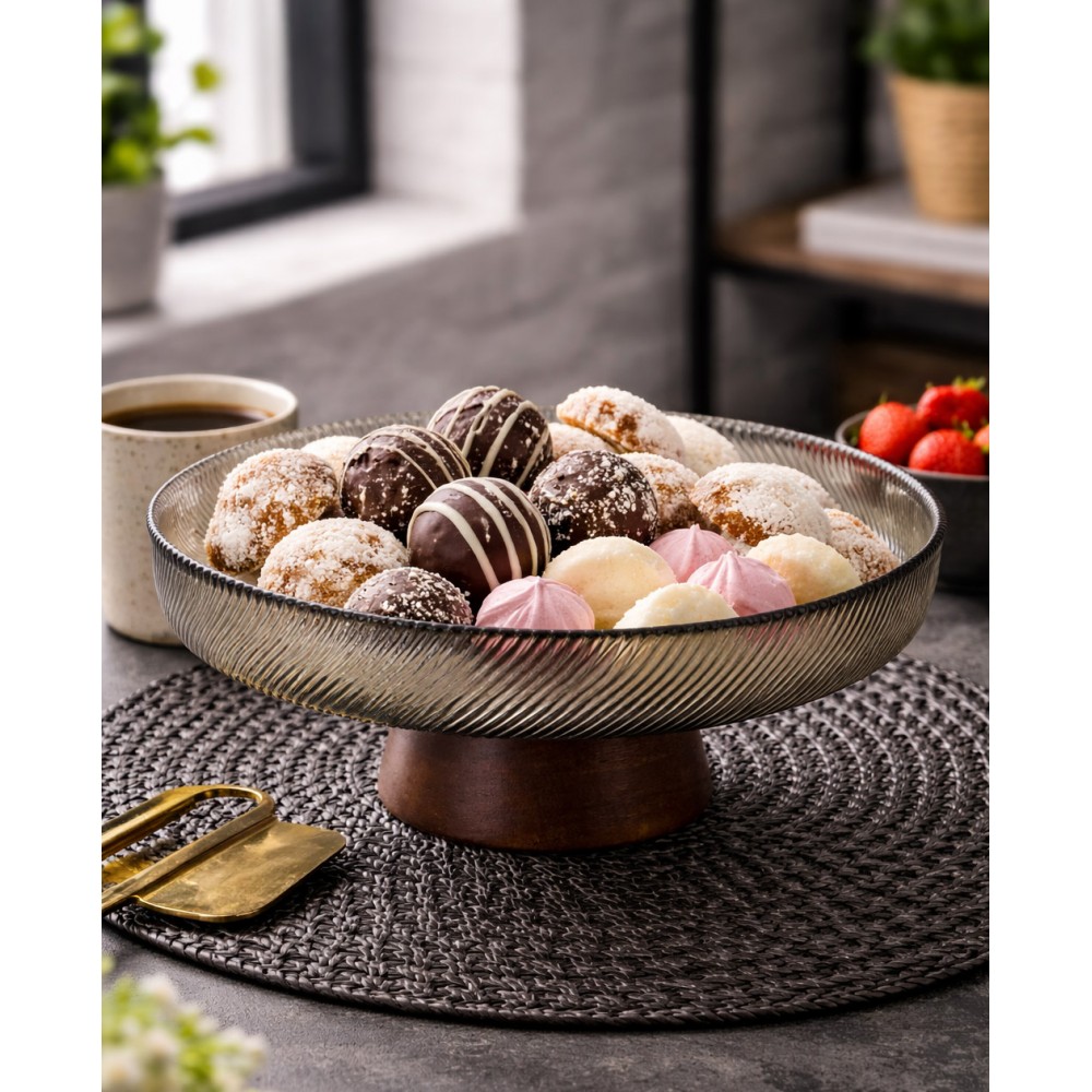 Wyjątkowa patera, która łączy w sobie nowoczesny design z naturalnym akcentem drewna. Górna część wykonana z efektownego szkła o delikatnym, promienistym wzorze pięknie odbija światło, nadając całości lekkości i elegancji. Stabilna, drewniana podstawa w ciepłym odcieniu doskonale kontrastuje ze szkłem, tworząc harmonijną i stylową kompozycję.