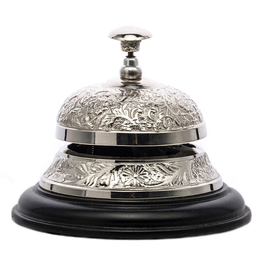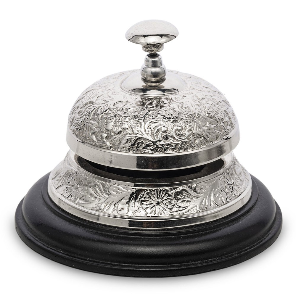 Elegancki dzwonek recepcyjny w klasycznym stylu to wyjątkowy element wyposażenia, który łączy funkcjonalność z dekoracyjną formą. Wykonany z metalu o srebrzystym wykończeniu, posiada piękne tłoczenia w kwiatowe wzory, które nadają mu luksusowego charakteru. Stabilna czarna podstawa zapewnia pewne ustawienie na ladzie recepcyjnej, biurku, komodzie lub stoliku.