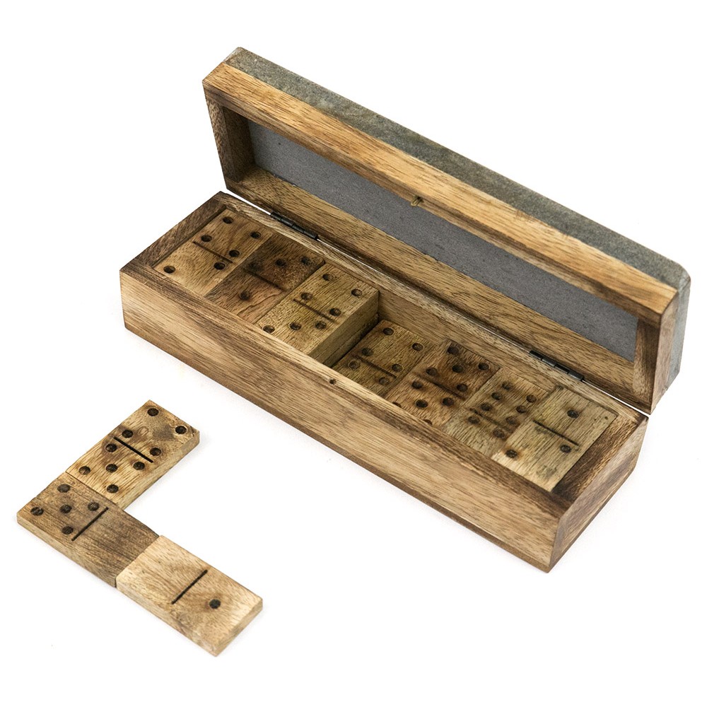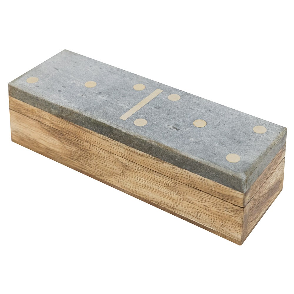 Niespotykanie wykonana gra Domino to połączenie klasycznej rozrywki i eleganckiego designu. Klocki zostały wykonane z wysokiej jakości drewna mango, które zachwyca naturalnym usłojeniem i trwałością. Całość umieszczona jest w solidnym pudełku z tego samego drewna, zamykanym elegancką pokrywą z marmuru, co nadaje zestawowi wyjątkowego charakteru i luksusowego wyglądu.