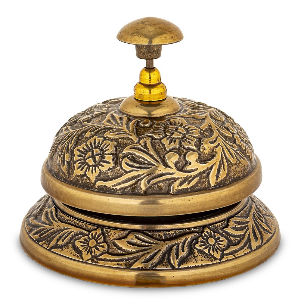 Elegancki dzwonek recepcyjny w klasycznym stylu to wyjątkowy element wyposażenia, który łączy funkcjonalność z dekoracyjną formą. Wykonany z metalu o złocistym wykończeniu, posiada piękne tłoczenia w kwiatowe wzory, które nadają mu luksusowego charakteru. Stabilna podstawa zapewnia pewne ustawienie na ladzie recepcyjnej, biurku, komodzie lub stoliku.