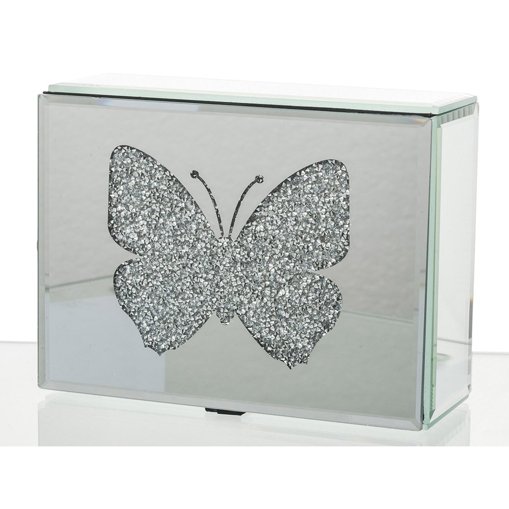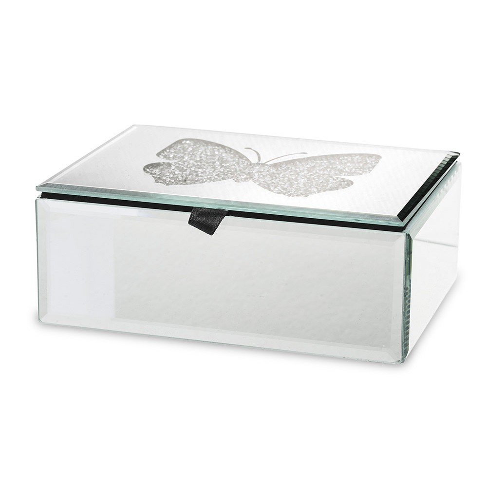 Bardzo estetyczna i zarazem przydatna szkatułka na biżuterię wykonana z luster. Wyróżnia się pięknie wykonanym motylem z ozdobnych kamyczków na górze pojemnika. Wykonana w taki sposób aby zachwycić najbardziej wymagających. Wewnątrz jedna przegroda na wszelaką biżuterię i drobiazgi, a wnętrze wyściełane jest czarnym zamszem. Dodatkowo spód również podklejony jest welurem co skutecznie zapobiegnie porysowaniu mebli. Ciekawy design sprawi że szkatułka będzie pięknie się prezentować na półce, komodzie czy stoliku.