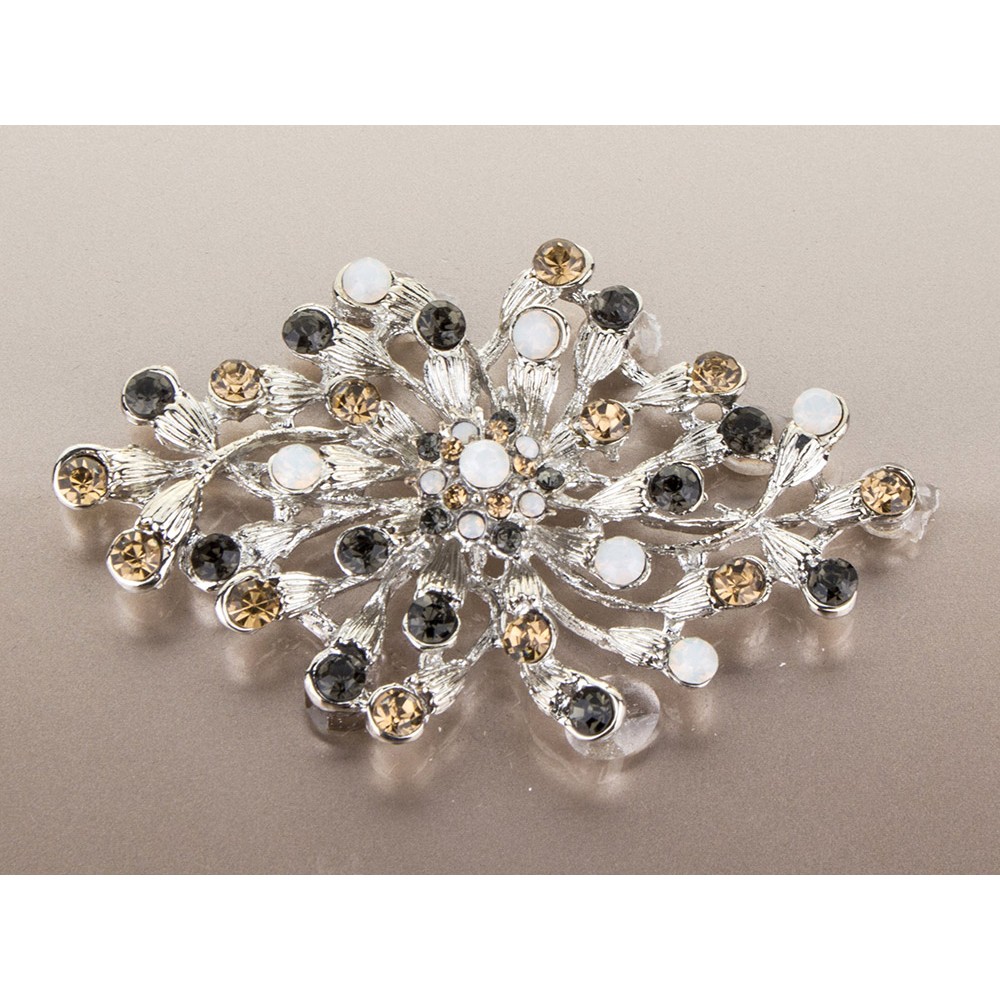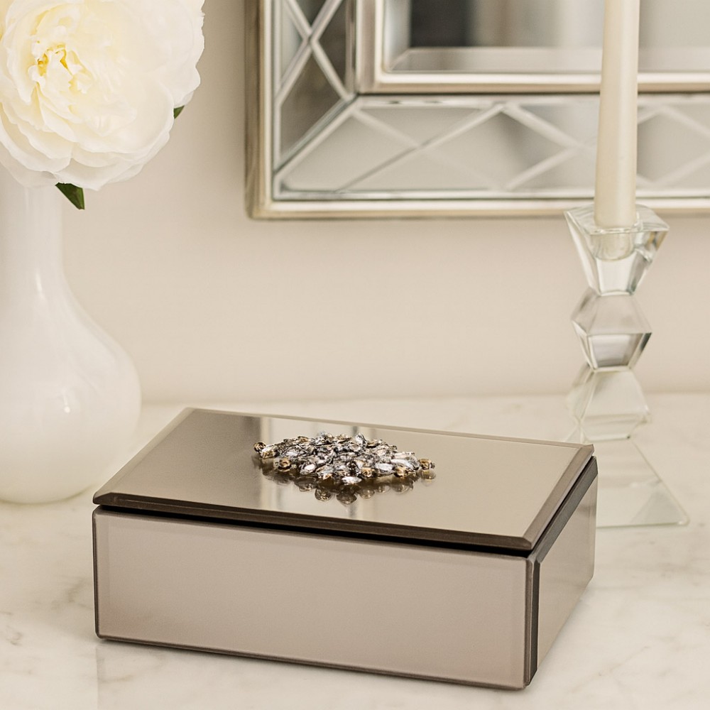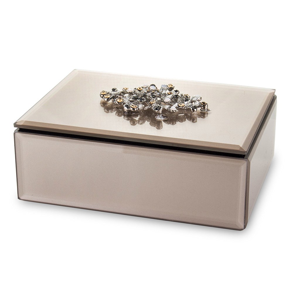 Wieczko szkatułki zdobi efektowna biżuteryjna aplikacja w odcieniach srebra i złota, która przyciąga wzrok i podkreśla elegancki charakter przedmiotu. Wnętrze wyłożone jest miękkim materiałem chroniącym biżuterię przed zarysowaniami.