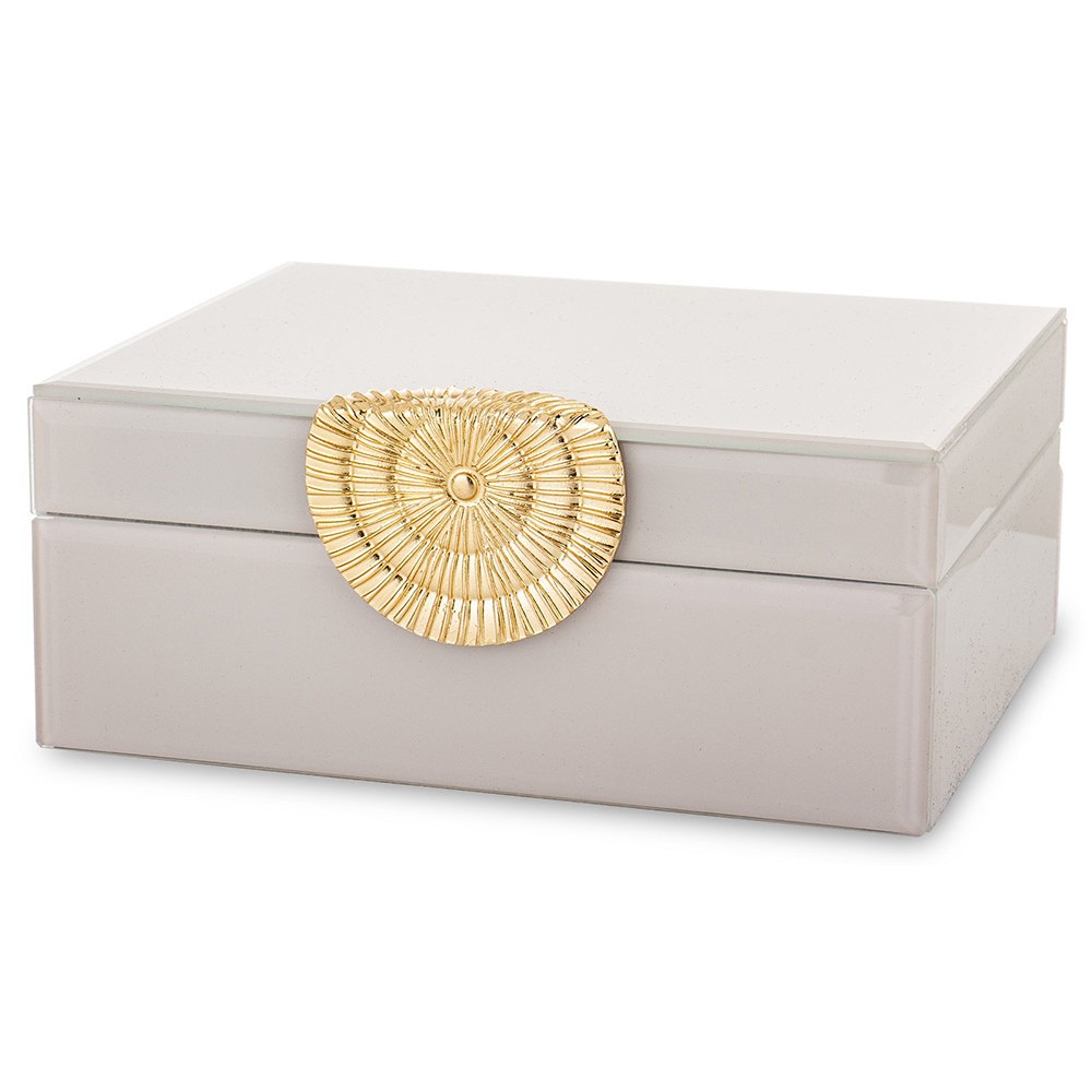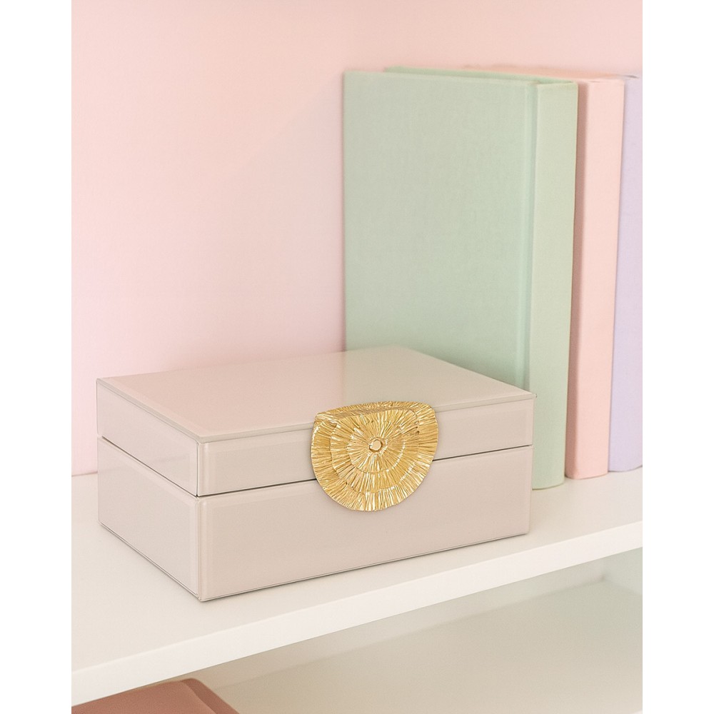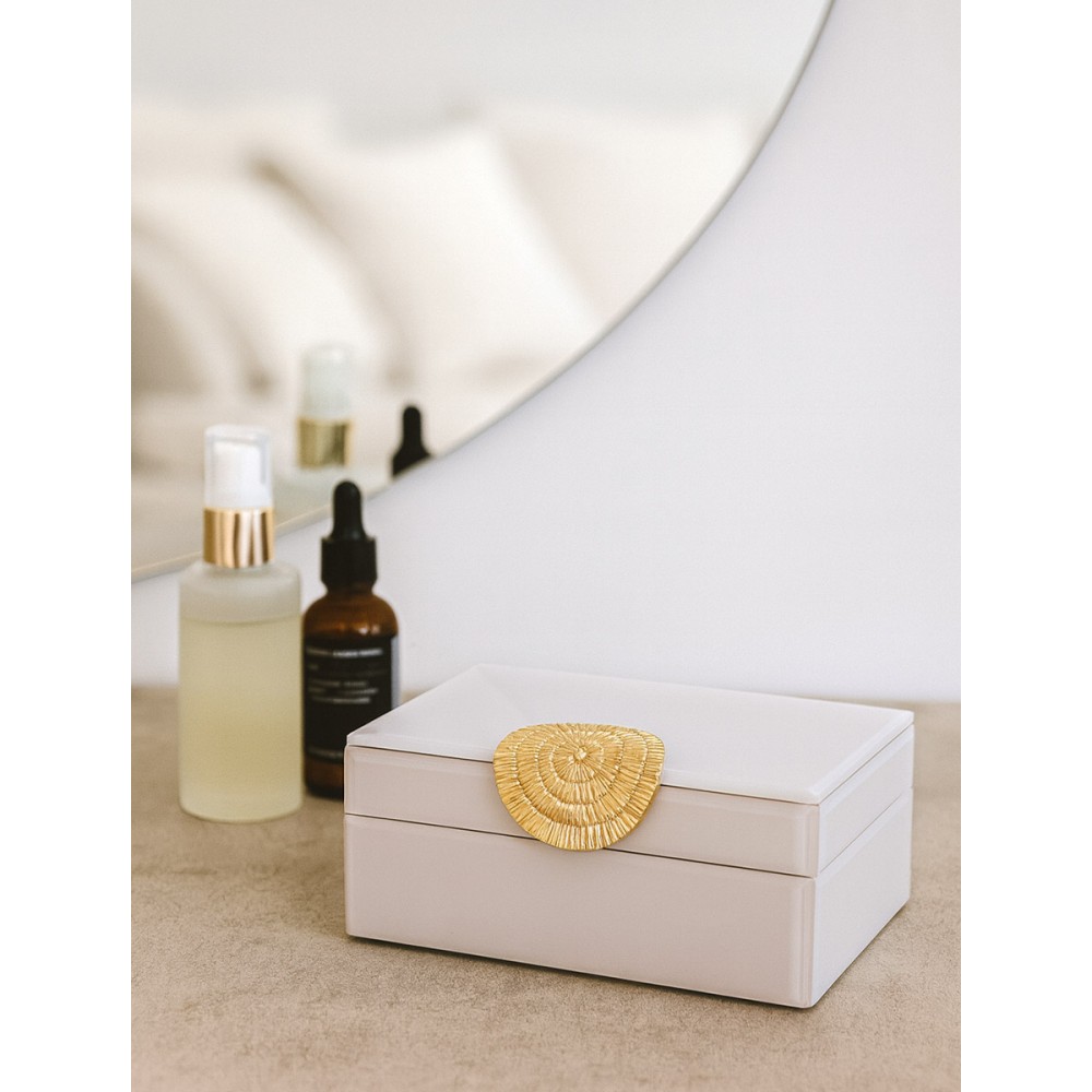 Ekskluzywna szkatułka na biżuterię szklana w kolorze beżowym (szampańskim) to elegancki dodatek, który zachwyca prostotą formy i wyrafinowanym stylem. Wykonana w taki sposób aby zachwycić najbardziej wymagających. Wewnątrz jedna przegroda na pierścionki i na pozostałe elementy biżuterii, a wnętrze wyściełane jest czarnym zamszem. Wykonana z wysokiej jakości szkła o subtelnym połysku, stanowi idealne połączenie klasy i nowoczesności.
