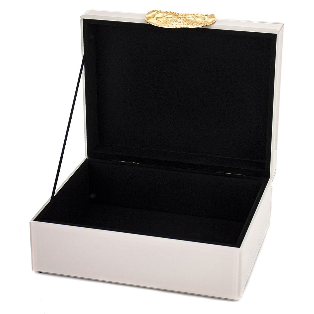 Wieczko zdobi ozdobny metalowy element w kolorze złotym, o finezyjnym, promienistym wzorze, który przyciąga wzrok i dodaje całości luksusowego charakteru. Wnętrze szkatułki wyłożone jest miękkim materiałem chroniącym biżuterię przed zarysowaniami i uszkodzeniami.