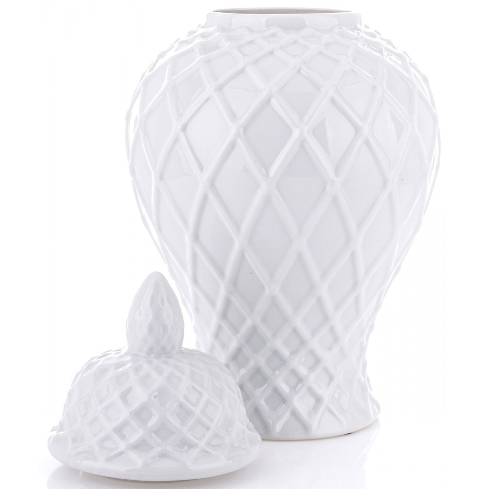 Biała, błyszcząca powierzchnia w połączeniu z efektownym, tłoczonym wzorem w romby nadaje mu luksusowego wyglądu. Dopełnieniem całości jest ozdobna pokrywa, która podkreśla jego klasyczny i ponadczasowy charakter.