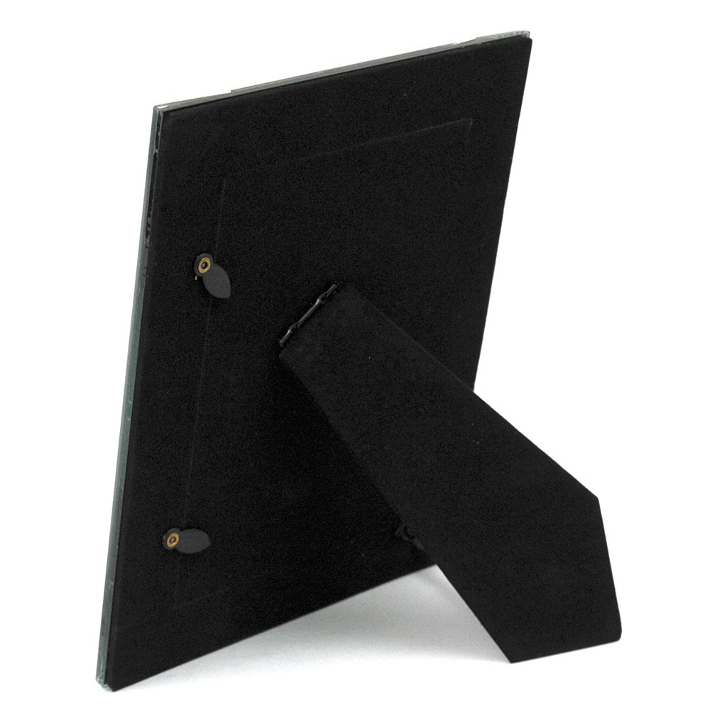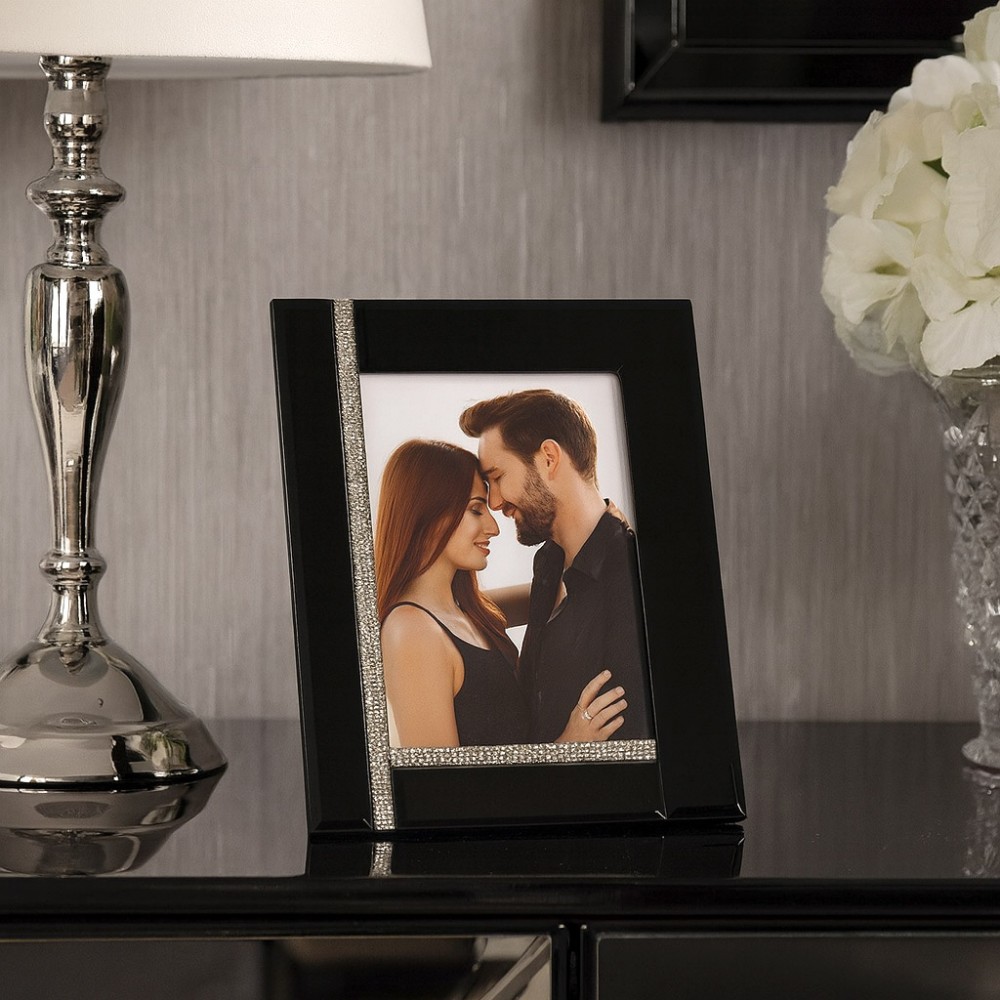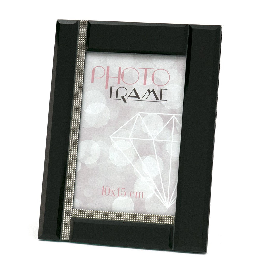 Nieprzeciętna lustrzana ramka w kształcie prostokąta w kolorze czarnym. Dodatkowo dekorowana jest srebrnym paskiem imitującym kamienie. Idealna do prezentowania ulubionych zdjęć w rozmiarze 13x18cm. Ramka wykonana jest ze szkła i kamieni w bardzo oryginalny sposób. Będzie ładnie prezentowała w eleganckim pomieszczeniu, a dzięki swojej estetyce będzie bardzo przyjemnym dodatkiem. Posiada możliwość stawiania w pionie lub poziomie.