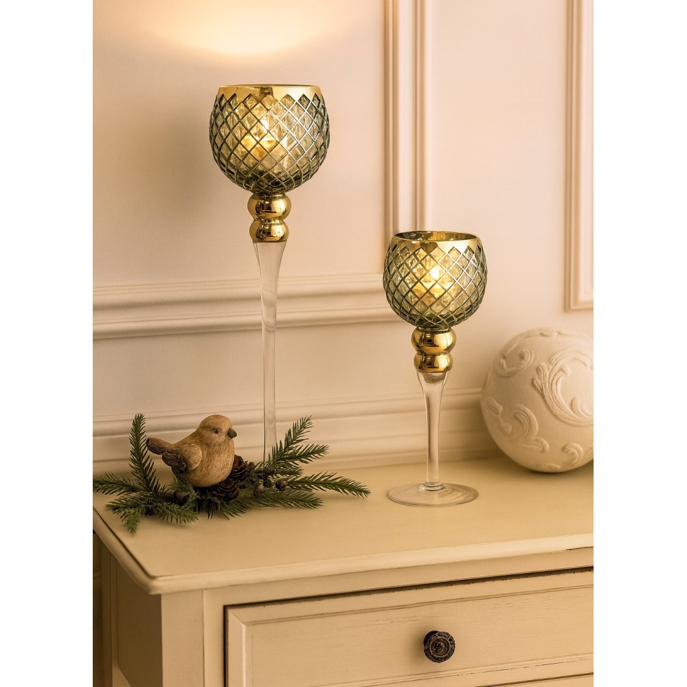 Niespotykany świecznik (1szt.) szklany na jedną świece w kolorze zielonym i złotym. Będzie wyjątkową ozdobą w salonie, jadalni czy przedpokoju. Jego unikatowy design sprawia, że obok takiego świecznika nikt nie przejdzie obojętnie. Można go zastosować do innej niezależnej dekoracji w Twoim domu wypełniając go w ciekawy sposób. Idealny dla miłośników niespotykanych dekoracji.
